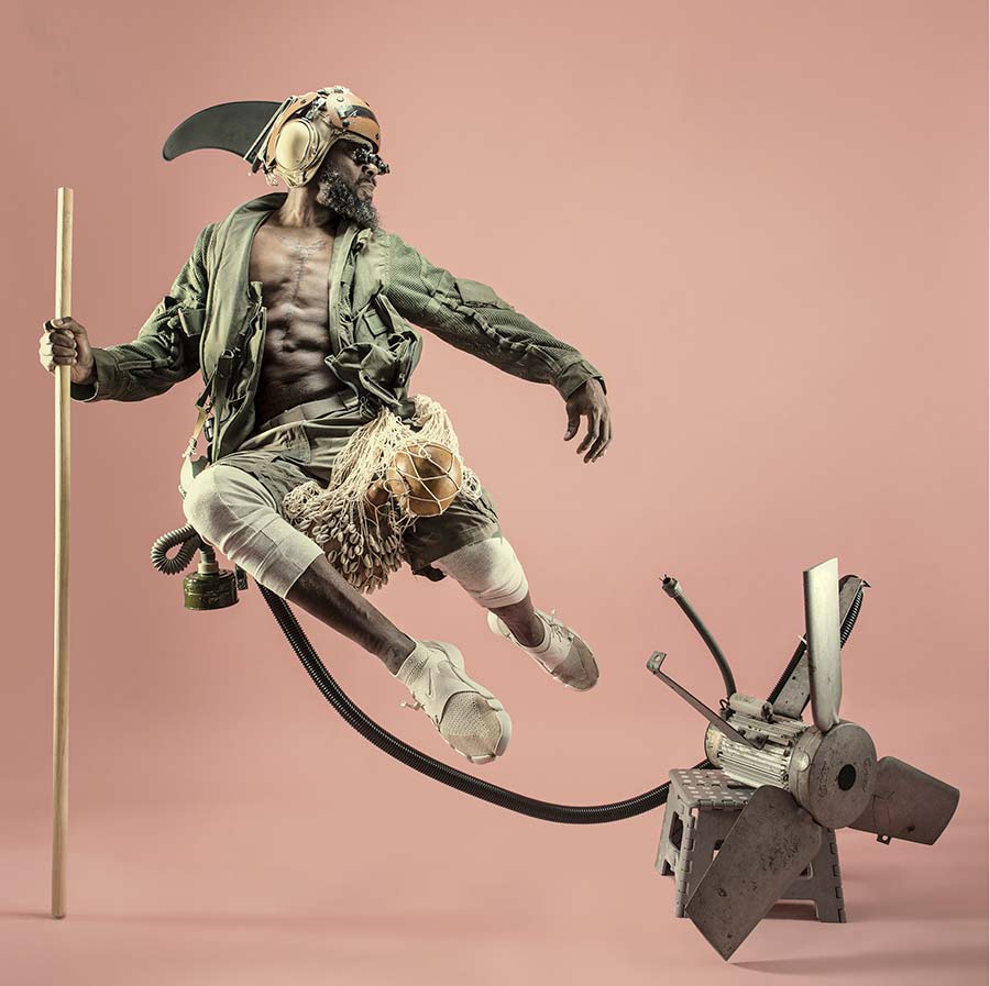 Benji Reid, whose works are primarily composed of self-portraits in eye-catching anti-gravitational poses. Reid seduces the viewer by creating alternative realms of hyper-reality, adorned with a medley of marvelous objects, set against imaginary surroundings. Choreography and photography unite in Benji Reid’s evocative images and his works have been shown in MoCADA (Museum of Contemporary African Diasporan Arts), New York, as part of the 2019 exhibition
