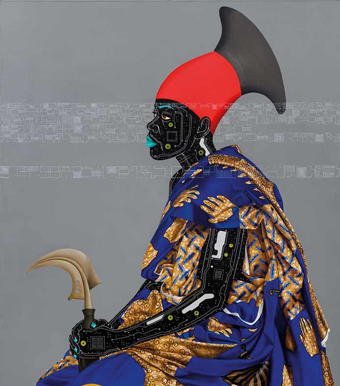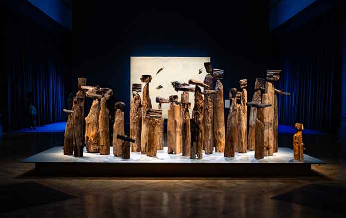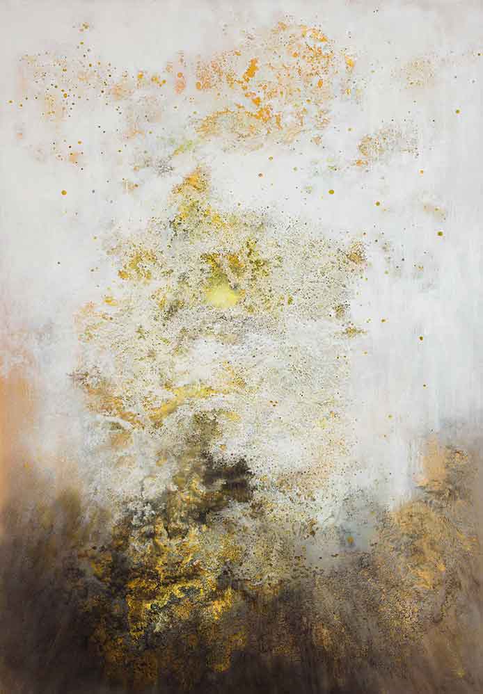 Alexis Peskine, made from Moon gold leaf, nails, coffee, and earth. Peskine’s practice addresses questions of the Black Experience and references the Congolese wooden effigies, the Minkisi power figures. Nails, in both ancient and contemporary African cultures, are associated with objects of immense symbolic and spiritual power. The artist is also represented by two remarkable portraits created from coffee infused by ink, screen printed onto handmade paper, surrounded by gold leaf.