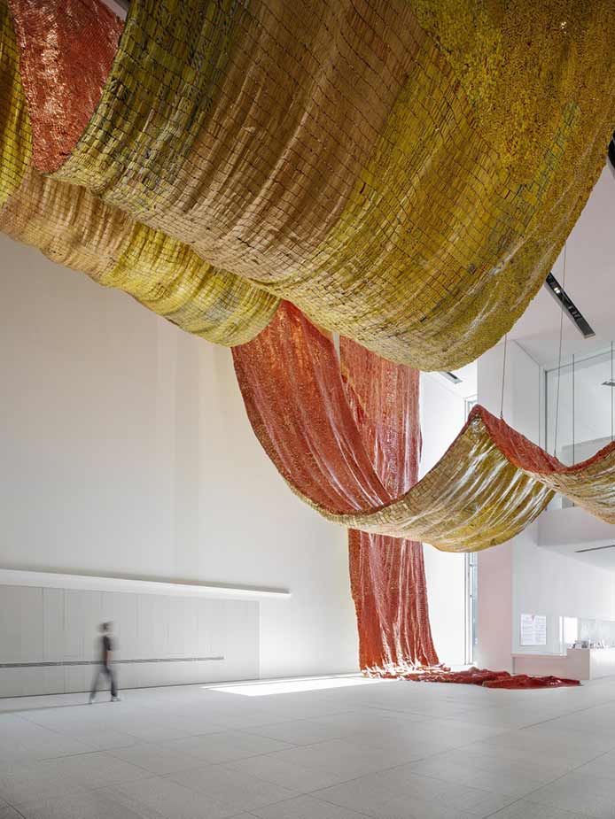 Ethereal Beauty, an intricate work, that reveals an extraordinary manifestation of colour and formation, resembling organic elements in nature. For the Bruges Triennial 2021, Nnenna Okore completed a monumental textile installation, And the World Keeps Turning, in which she stretched PVC fabric around the Poertoren (Gunpowder Tower) in Bruges.