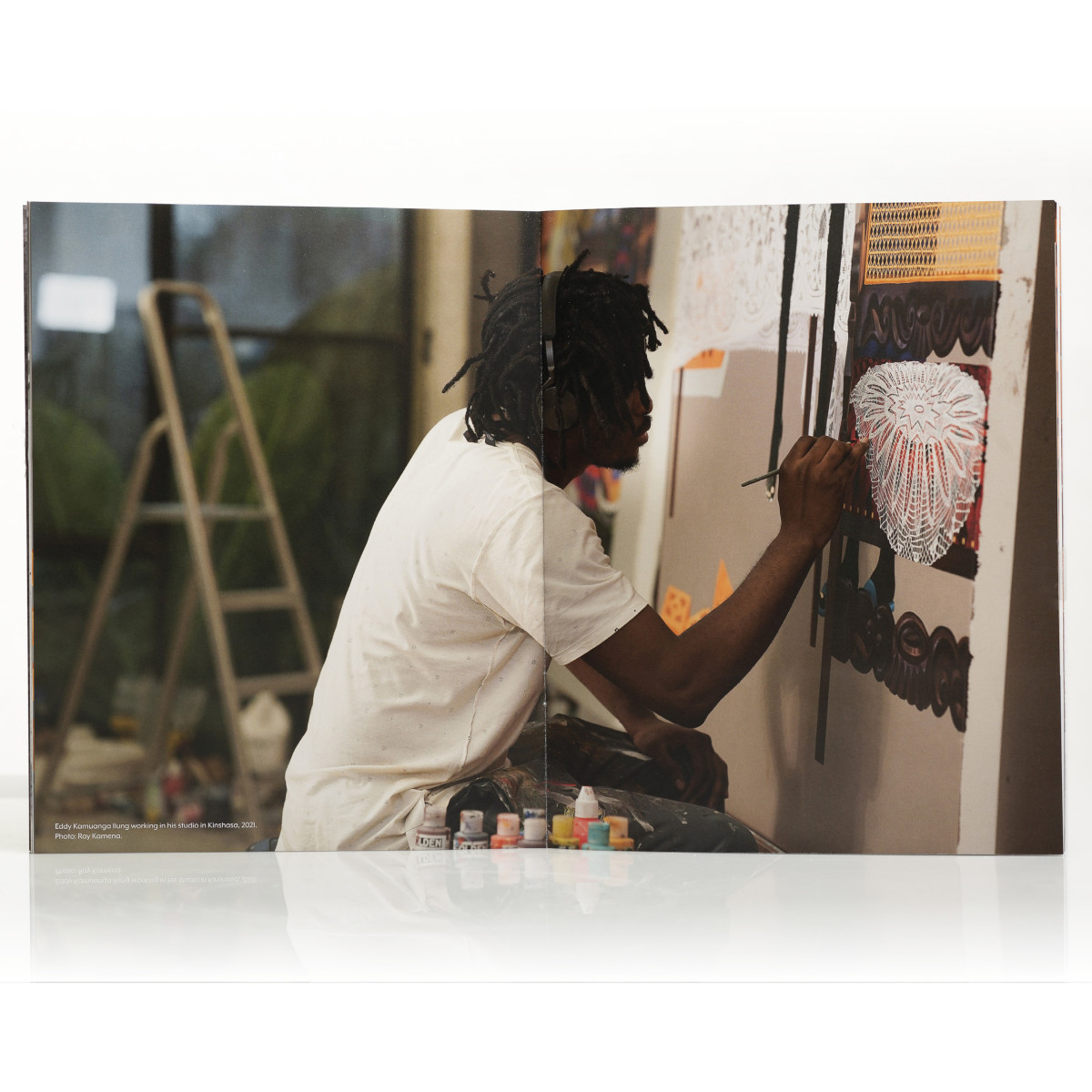 Born in the Democratic Republic of Congo in 1991, Eddy Kamuanga Ilunga studied painting at the Académie des Beaux-Arts in Kinshasa. While the strict, almost 19th-century style of formal figuration that has been taught at the Académie since its colonial-era founding allowed the artist to develop sophisticated painterly skills, ultimately, he found its program conceptually stifling, and abandoned his studies there, in 2011. Though there was little in place supporting that decision, he quickly aligned himself with other artists to establish M’Pongo, a group studio where a diverse set of young artists shared ideas and exhibited together to generate their own vibrant scene, which tapped into the high-energy creativity of contemporary Kinshasa.