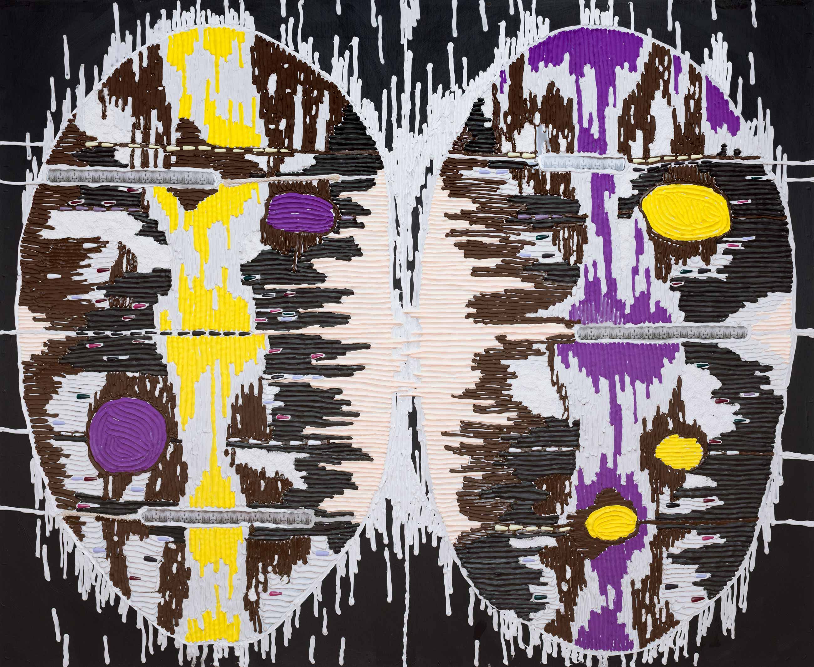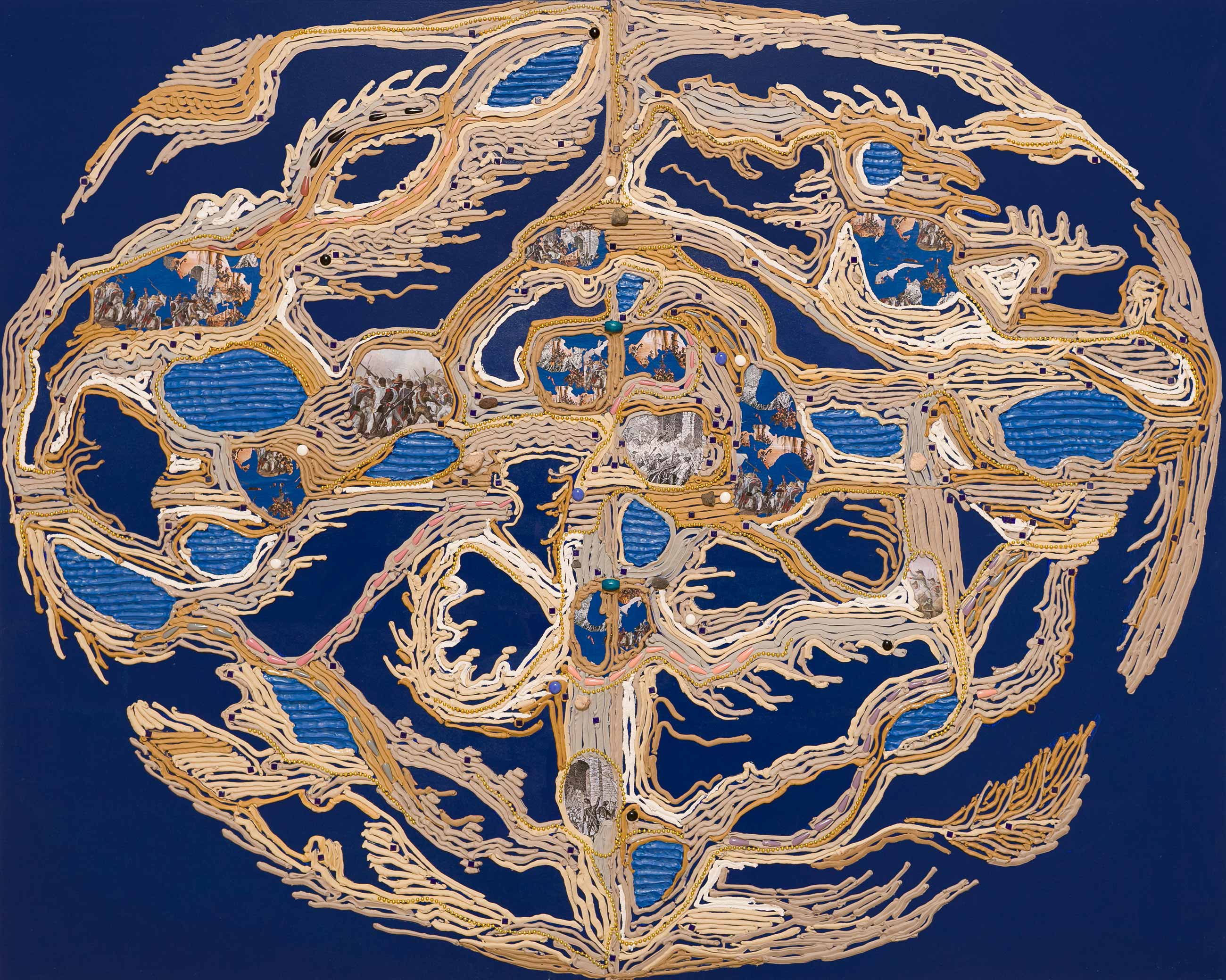 Weber was first exhibited at October Gallery in the group exhibition Emergent Energies (2024), which featured her large-scale relief paintings and hanging sculptures. Her work has since been included in October Gallery exhibitions Material Sensibilities (2025) and Lineages (2026). Her relief paintings, such as Stream of Consciousness from the Cartographies series, are composed of richly textured collage materials including silicone, acrylic paste, modelling compound, resin, print, acrylic nails, beads, corals and shells on wooden board. These works propose an intuitive mapping of the intersectional body that resists Western notions of the grid and linear time, favouring organic forms, energy fields and cyclical temporality as acts of resistance. Weber embeds her fingerprint as an archival trace within the surface, incorporates acrylic nails as symbols of Black female empowerment and scales the wooden supports to her own bodily dimensions. The works invite viewers to encounter the canvas as both an extension of the self and an archive of the intersectional body.