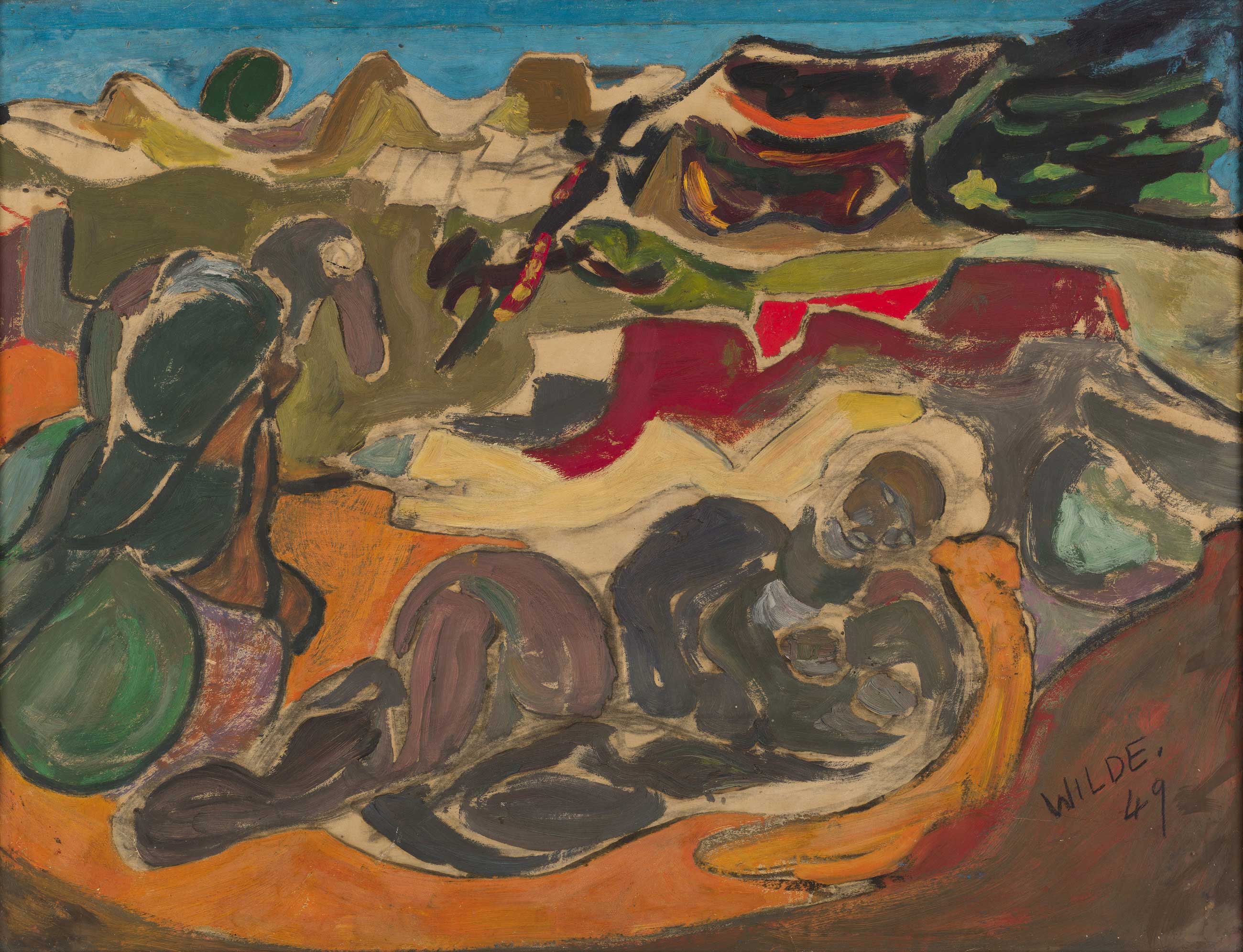 In 1979 October Gallery opened with an exhibition of Gerald Wilde and has since remained committed to bringing Wilde to the attention of a wider audience in the firm belief that he has yet to achieve full recognition as a major British artist of the 20th century. From the intensity of his early work, through to the liberation in such series as Pompeii to the more colourful world of his later years, as well as in the Intelligence Now series – Wilde confronts us on an abstract level as well as on the level of symbols and dreams. David Sylvester wrote, ‘His work has the exhilaration of a disaster just averted.’ And with this capacity to create a chaotic world precariously held in check, Wilde would seem remarkably contemporary in his approach. John Berger stated that, ‘The trapped in all of us can respond to these works because they strive for release.’ His artwork serves as both prophetic and as a prayer. ‘A painter like Gerald Wilde is born to his own visionary dimensions.’ Joyce Cary During the 1940s and '50s the Hanover Gallery and the ICA hosted solo exhibitions of Wilde’s work and, in 1977 the Serpentine Gallery held a retrospective of his work. Three paintings by Wilde are in the Tate collection and he counted Sir Kenneth Clark, Sir Edward Marsh and Peter Watson amongst his private collectors.