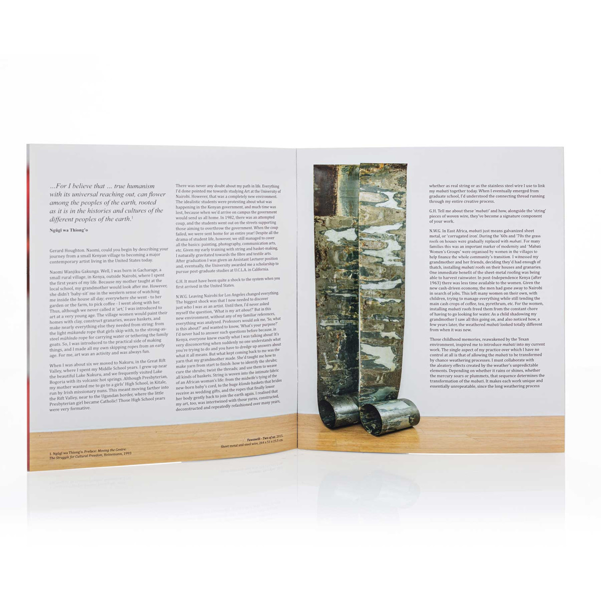 The exhibited works are predominantly wall-hanging sculptures ingeniously created from tin cans, steel wire and oxidised sheet metal forms. While the techniques Gakunga uses are common to the fibre arts across many traditions, her chosen materials are not. Corroded sheet metal, rusted tin cans and stainless steel wire all follow the concept of Jua Kali, a Swahili expression literally meaning ‘under the hot sun’ that refers to the idea of chance effects created out of things which have been discarded. Here, nothing goes to waste and waste materials become the medium for a wholly new focus of attention. This highly developed approach to repurposing discarded objects echoes the sophisticated creations of artists such as Nnenna Okore.