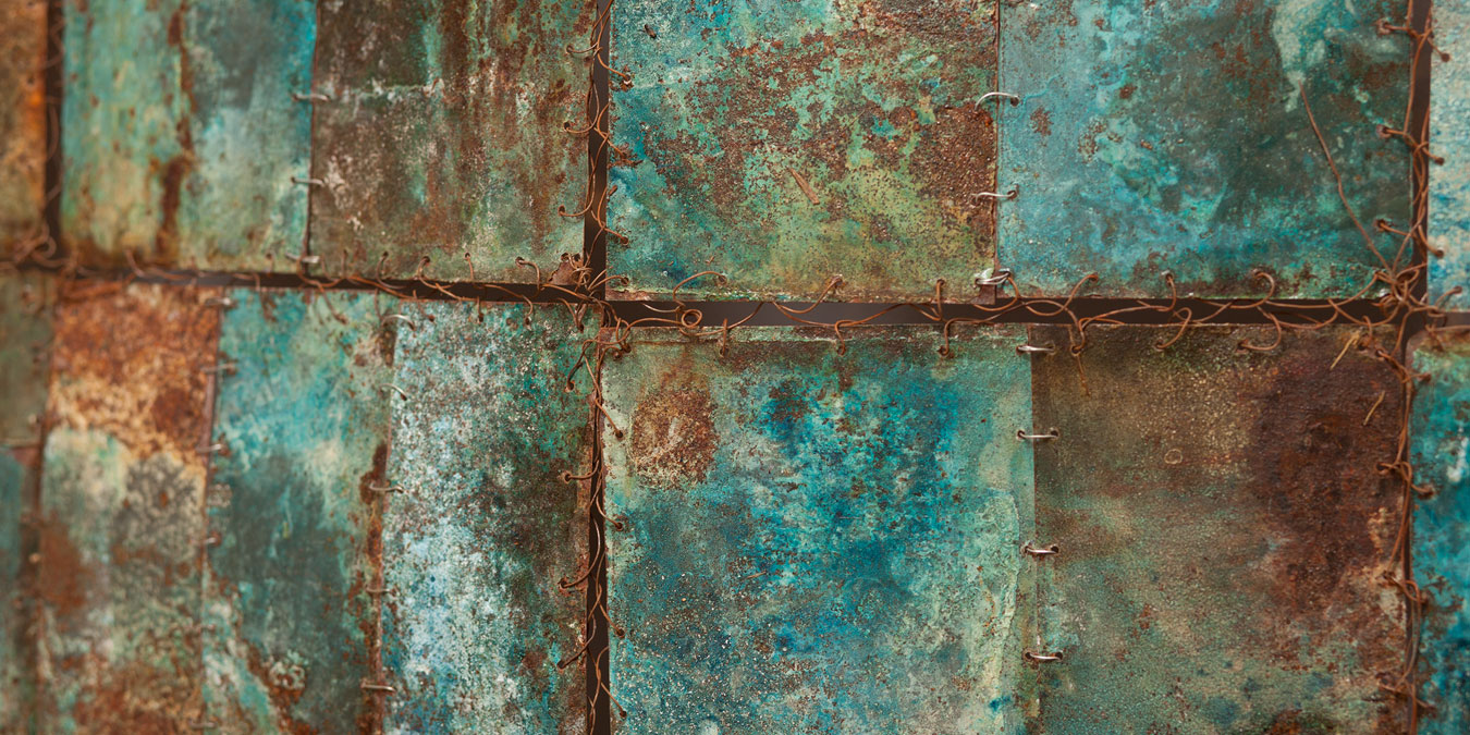 Galvanised sheet metal, known in Swahili as mabati, is ubiquitous in Kenya. Used mainly for roofing materials and walls, this sheet metal is particularly associated with the Mabati Women Groups and their empowering community housing projects of the ‘60s. Gakunga observed the success of their efforts, the harvesting of water from the new roofs and the consequent ageing of the material itself. Mirroring these weathering effects in her own artistic process, she deliberately saturates rolls of sheet metal in water, a process that oxidises the submerged surfaces, occasionally adding dyes to create different colours and other more complex effects. Finally, Gakunga selects, cuts and links the resultant pieces to assemble her wall-hangings. These striking sculptures reflect, at one and the same time, both the mabati’s enduring functionality and its fragility; the delicate transformations etched in metal by the corrosive effects of water, chance and time emphasising an ethereal, transient beauty.