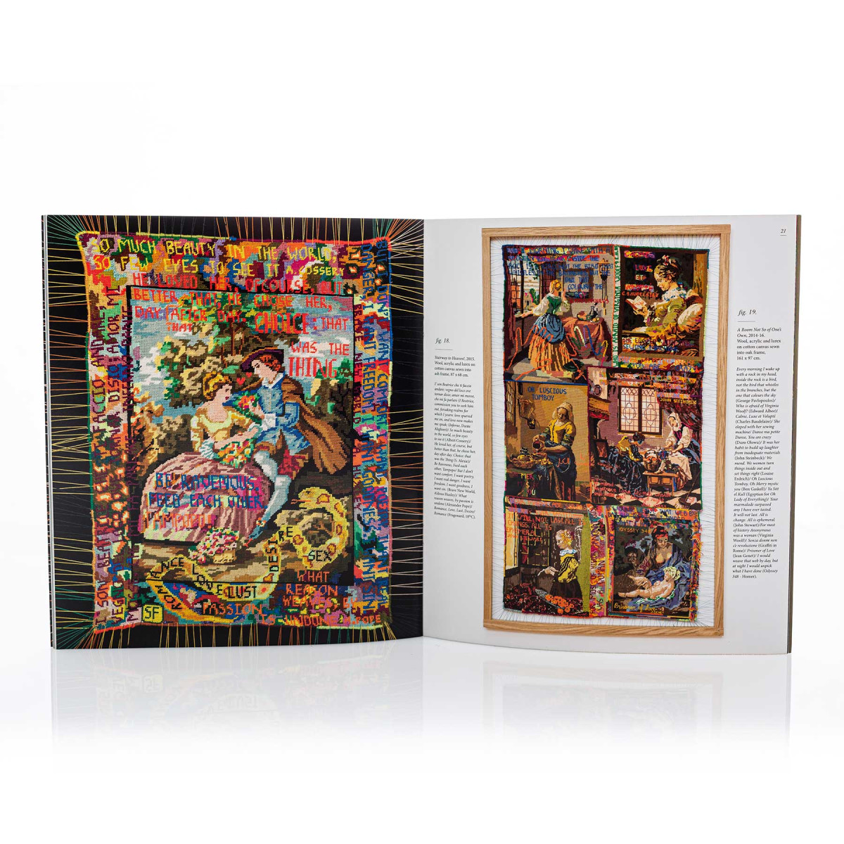 Franquet reworks found tapestries, showing a preference for those based on canonical works of art. She overlays these with further images and with found words from poets and thinkers, and text messages from friends. She cites Giacomo Leopardi’s Zibaldone da Pensiere, with its dense collation of thoughts, ephemera and philosophies, as influencing her approach. The laborious process of unpicking, repairing and reworking can take months, resulting in a metamorphosis achieved by the magic power of the needle.