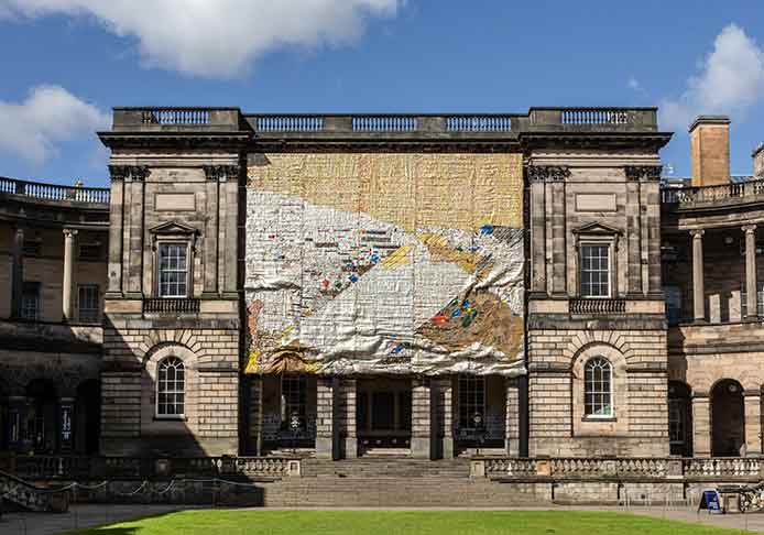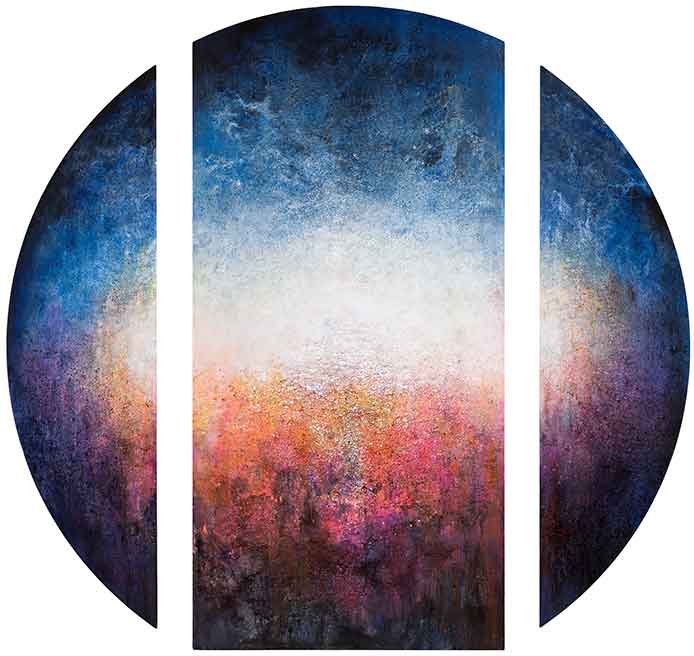 Ethereal Beauty, an intricate work, that reveals an extraordinary manifestation of colour and formation, resembling organic elements in nature. For the Bruges Triennial 2021, Nnenna Okore completed a monumental textile installation, And the World Keeps Turning, in which she stretched PVC fabric around the Poertoren (Gunpowder Tower) in Bruges.