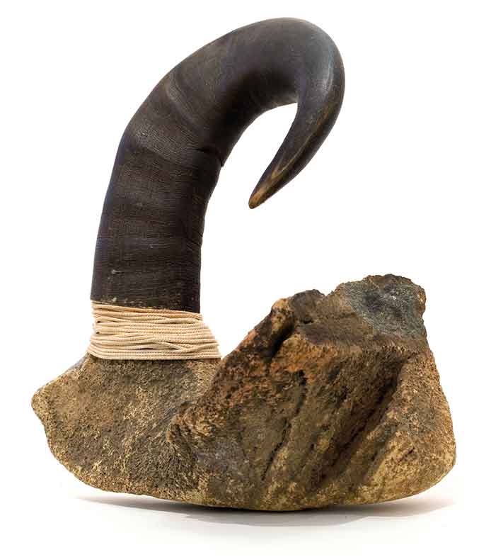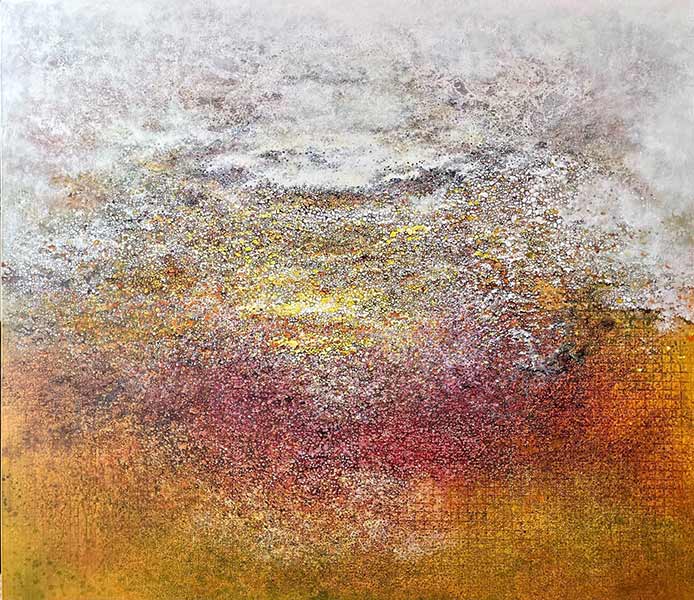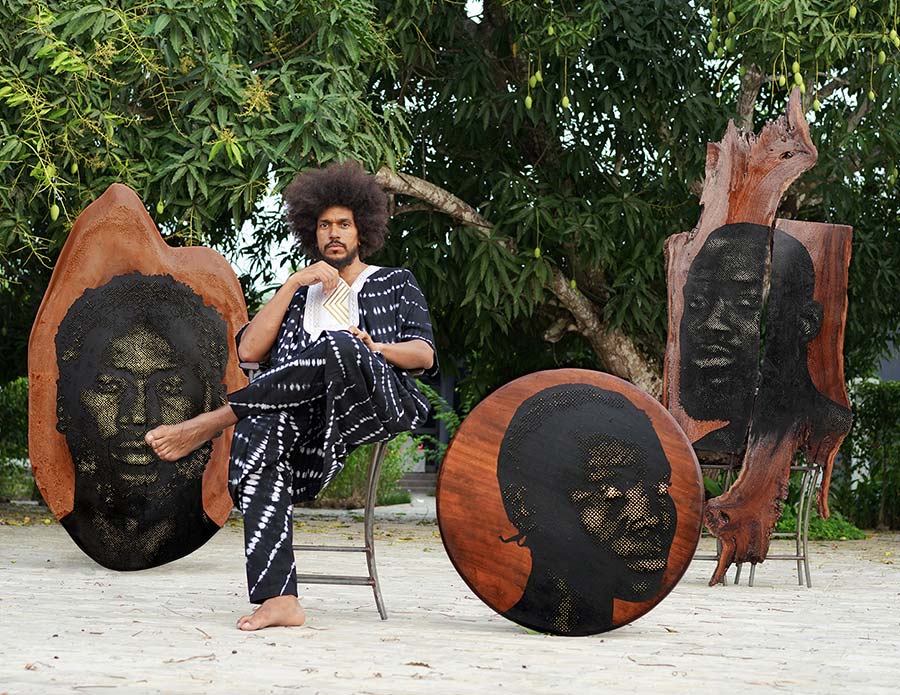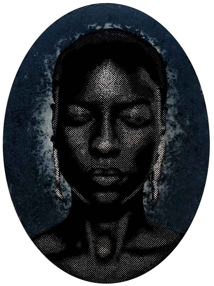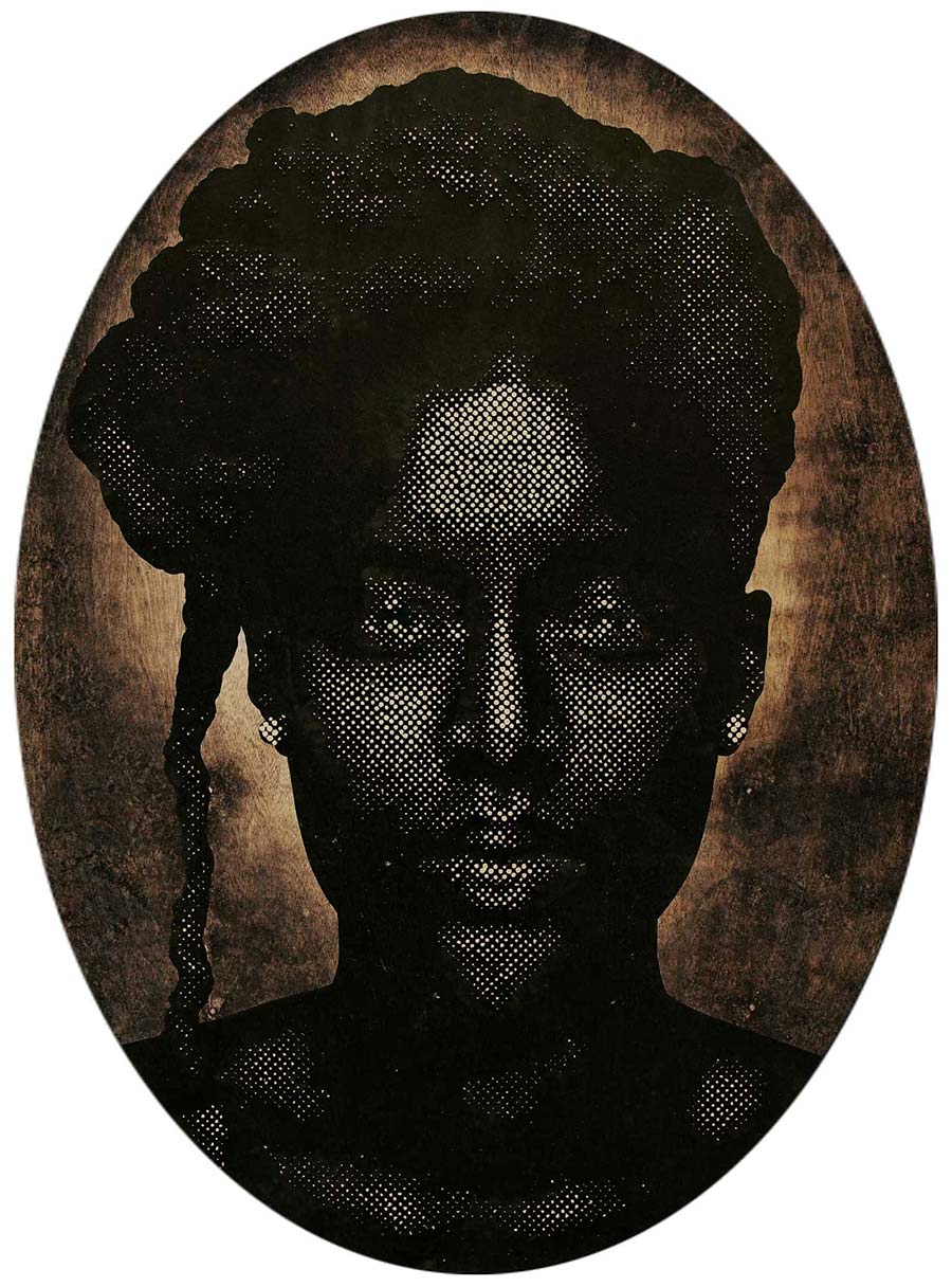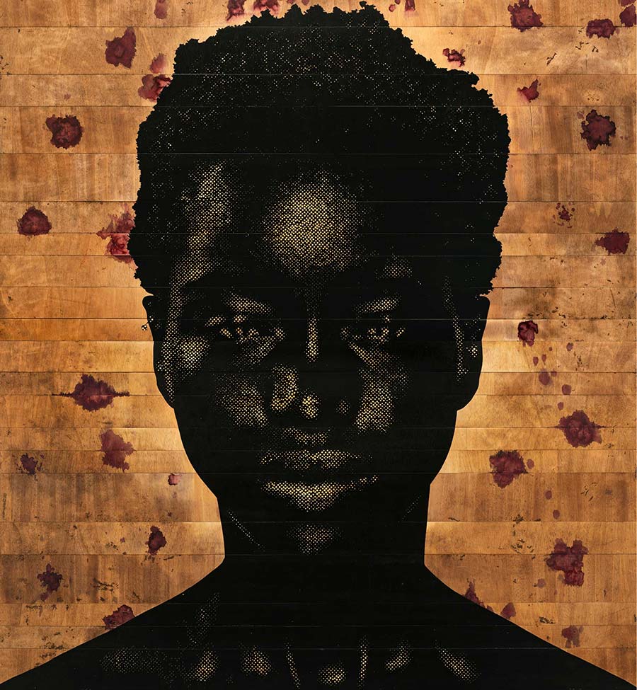 Alexis Peskine, made from Moon gold leaf, nails, coffee, and earth. Peskine’s practice addresses questions of the Black Experience and references the Congolese wooden effigies, the Minkisi power figures. Nails, in both ancient and contemporary African cultures, are associated with objects of immense symbolic and spiritual power. The artist is also represented by two remarkable portraits created from coffee infused by ink, screen printed onto handmade paper, surrounded by gold leaf.