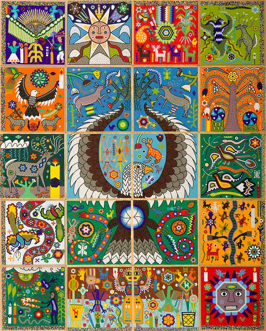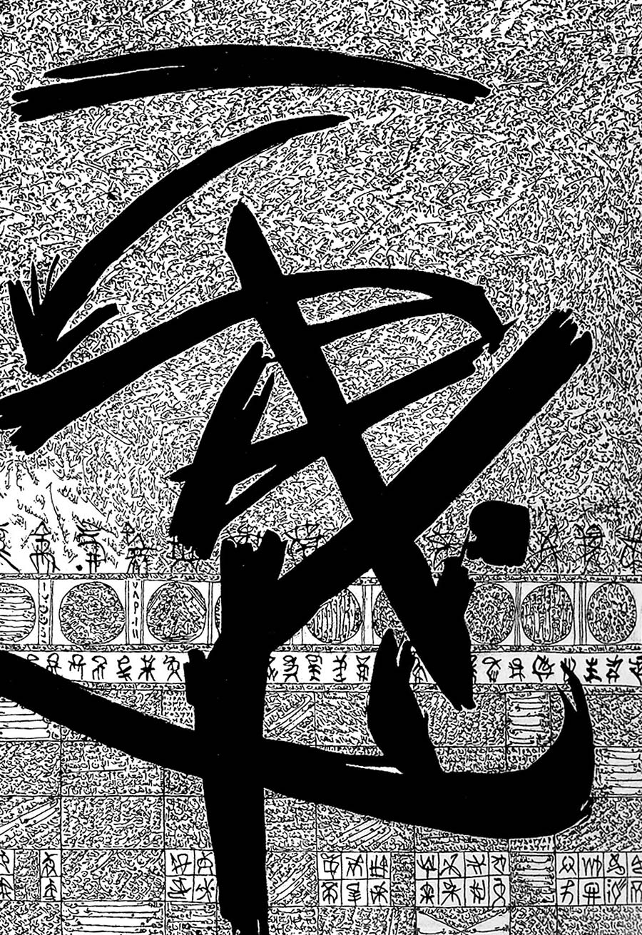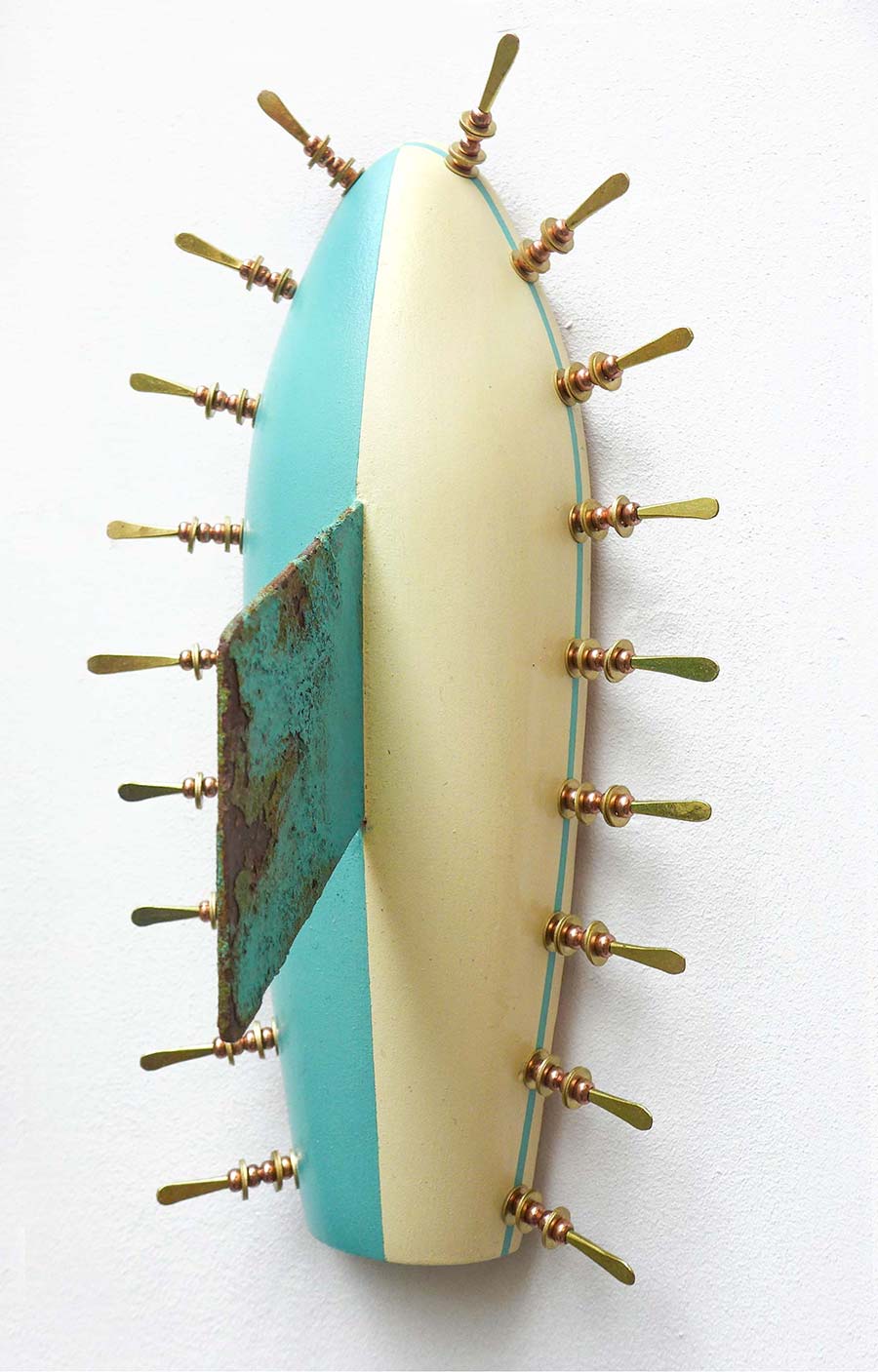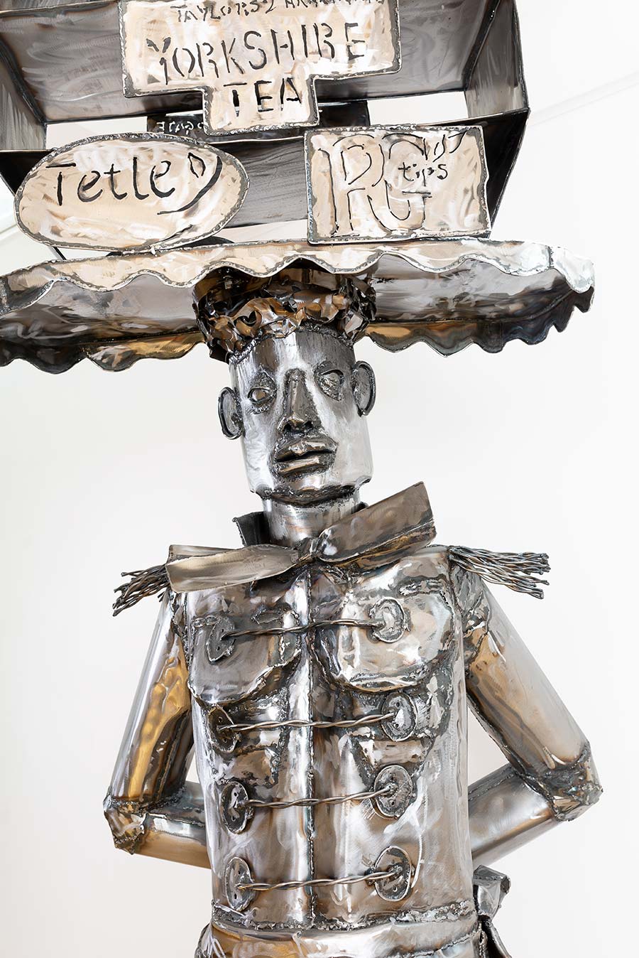 Alexis Peskine, made from Moon gold leaf, nails, coffee, and earth. Peskine’s practice addresses questions of the Black Experience and references the Congolese wooden effigies, the Minkisi power figures. Nails, in both ancient and contemporary African cultures, are associated with objects of immense symbolic and spiritual power. The artist is also represented by two remarkable portraits created from coffee infused by ink, screen printed onto handmade paper, surrounded by gold leaf.