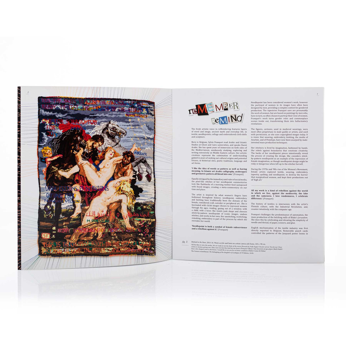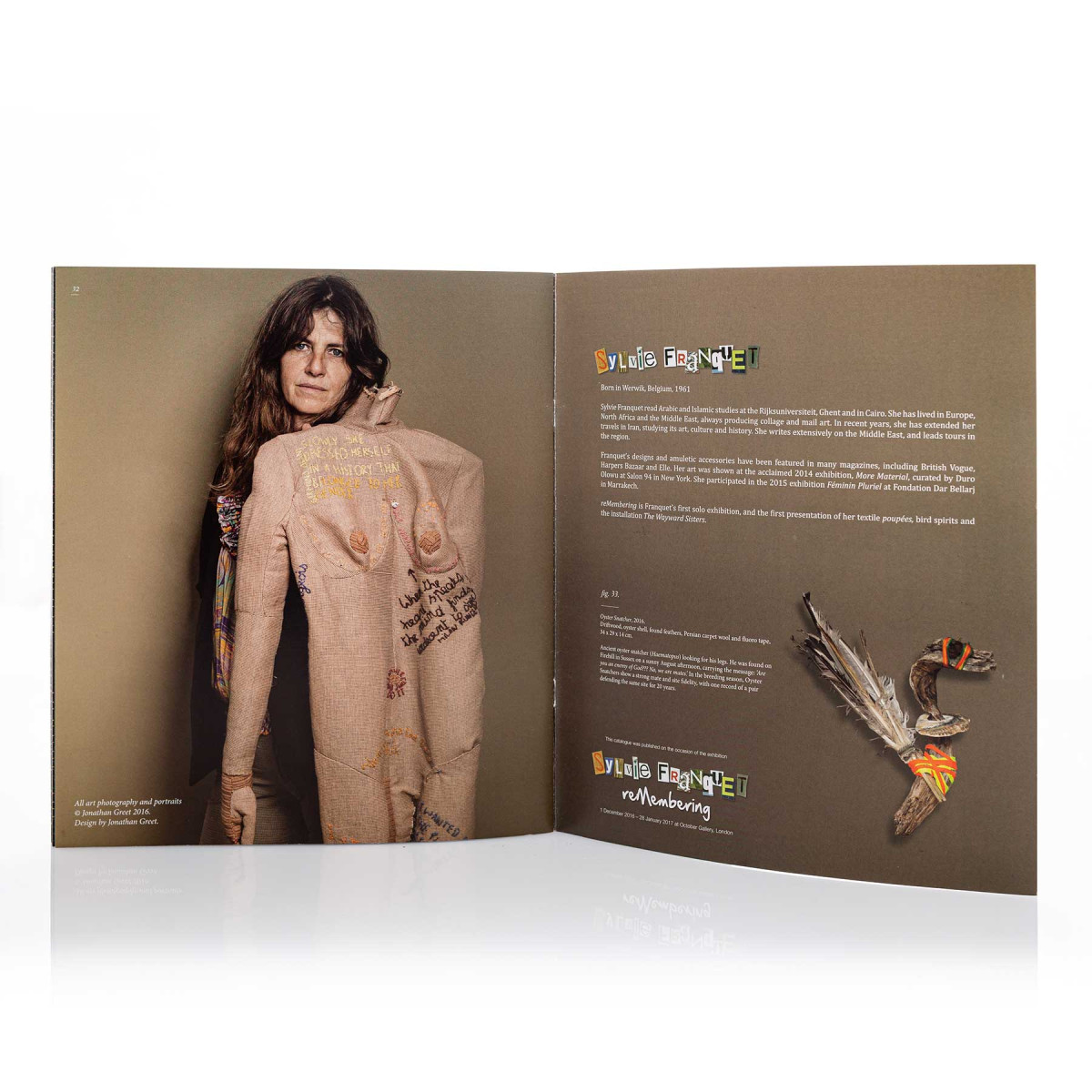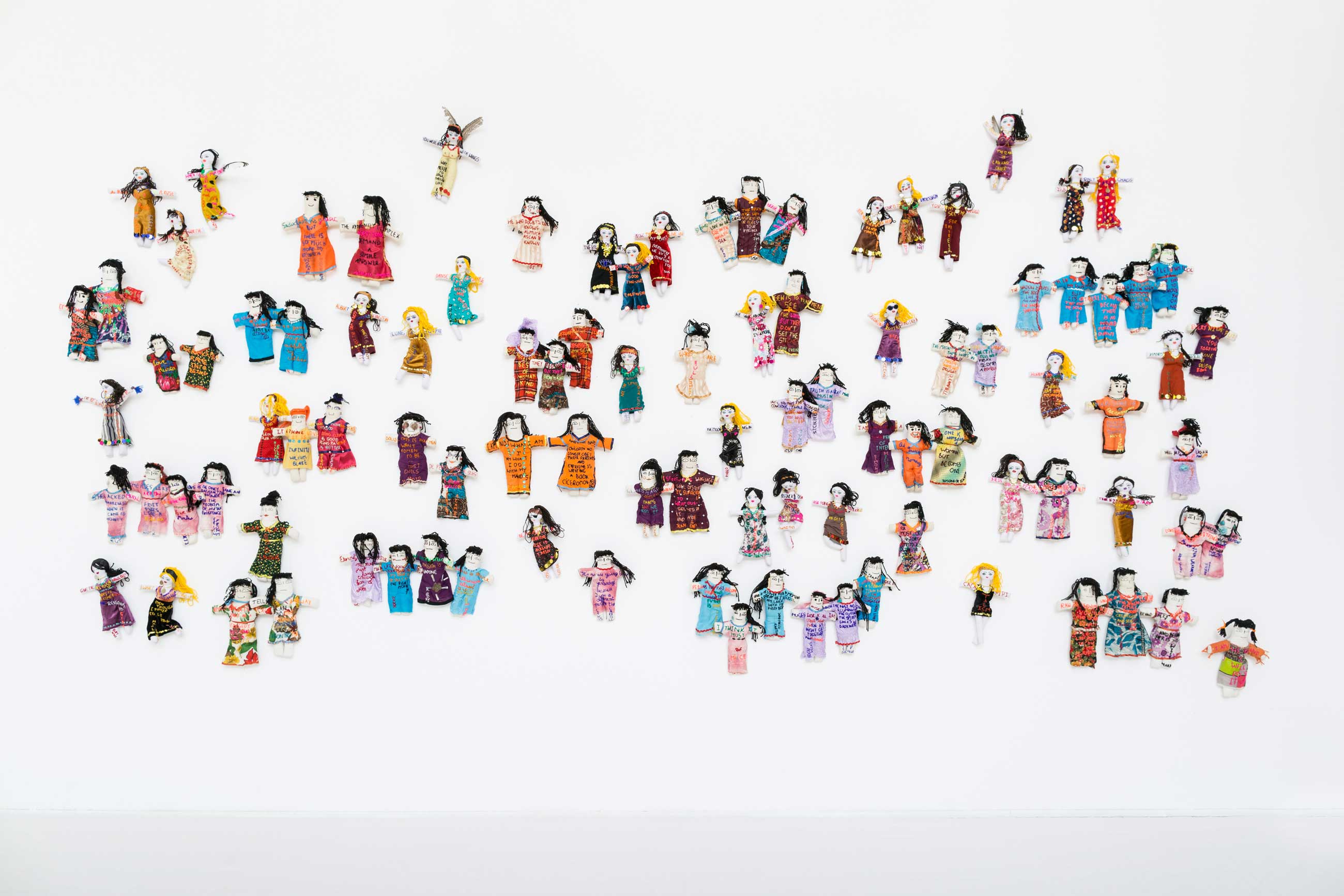 Franquet’s amuletic accessories have been featured in many magazines, including British Vogue, Harper’s Bazaar and Elle. Her intricate tapestries were shown at the acclaimed 2014 exhibition, More Material, curated by Duro Olowu at Salon 94 in New York. She participated in the 2015 exhibition Feminin Pluriel at Fondation Dar Bellarj in Marrakech. reMembering, Franquet’s first solo exhibition, was presented at October Gallery in 2016. Her graffitilike reworked needlepoints exploring a feminist gaze, were accompanied by life-size textile poupees, assemblages evoking bird spirits and The Wayward Sisters, an installation of 99 Egyptian rag dolls embroidered with aphorisms for survival. In 2019, her major solo exhibition reCollecting, at The Harley Gallery, Nottinghamshire, evoked the strong bond of her femaleness with nature through needlework, plant embroideries and ‘Rock Women’ sculptures.