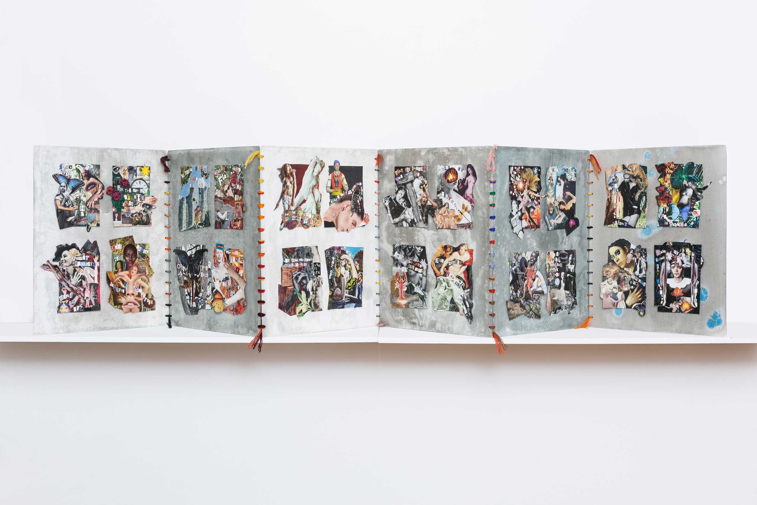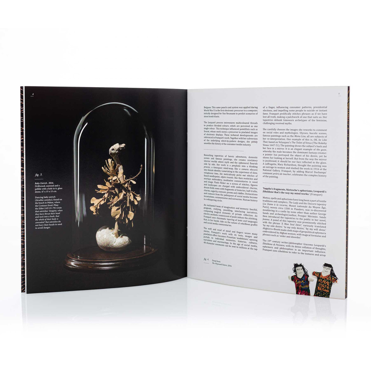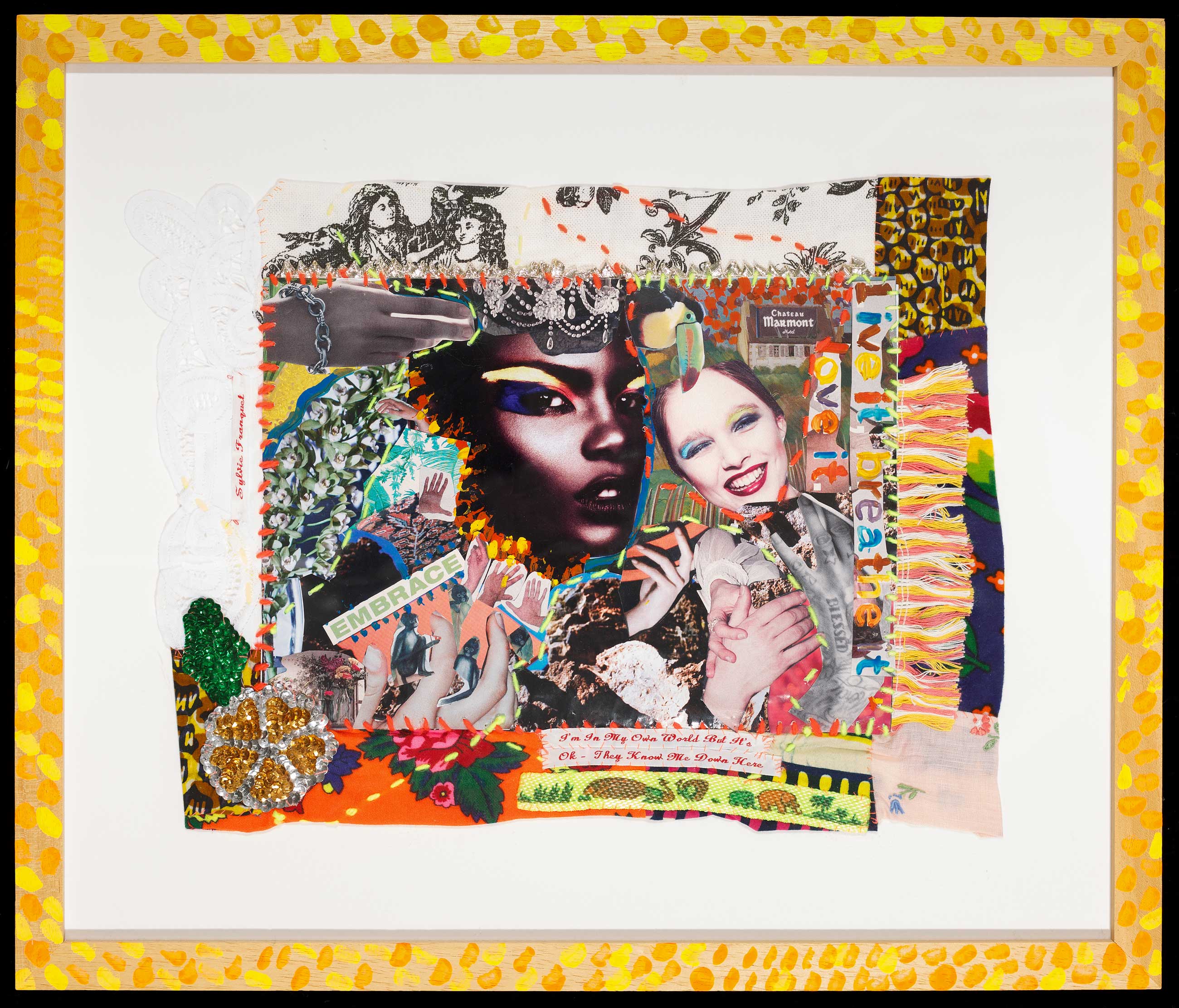 Franquet’s amuletic accessories have been featured in many magazines, including British Vogue, Harper’s Bazaar and Elle. Her intricate tapestries were shown at the acclaimed 2014 exhibition, More Material, curated by Duro Olowu at Salon 94 in New York. She participated in the 2015 exhibition Feminin Pluriel at Fondation Dar Bellarj in Marrakech. reMembering, Franquet’s first solo exhibition, was presented at October Gallery in 2016. Her graffitilike reworked needlepoints exploring a feminist gaze, were accompanied by life-size textile poupees, assemblages evoking bird spirits and The Wayward Sisters, an installation of 99 Egyptian rag dolls embroidered with aphorisms for survival. In 2019, her major solo exhibition reCollecting, at The Harley Gallery, Nottinghamshire, evoked the strong bond of her femaleness with nature through needlework, plant embroideries and ‘Rock Women’ sculptures.