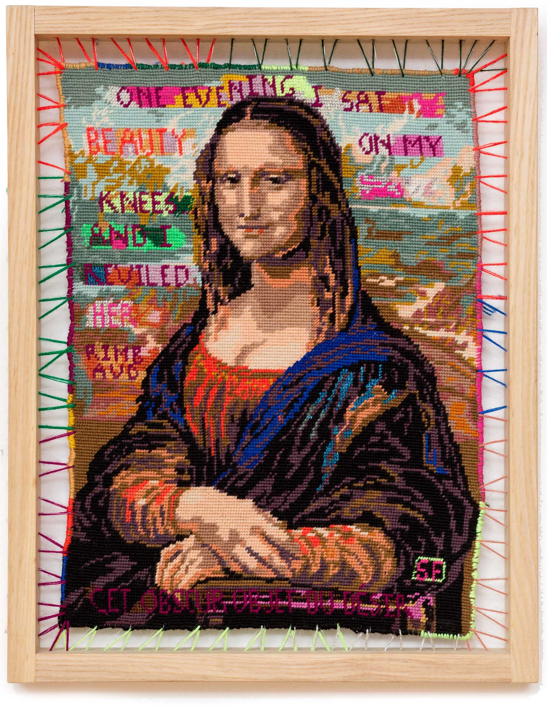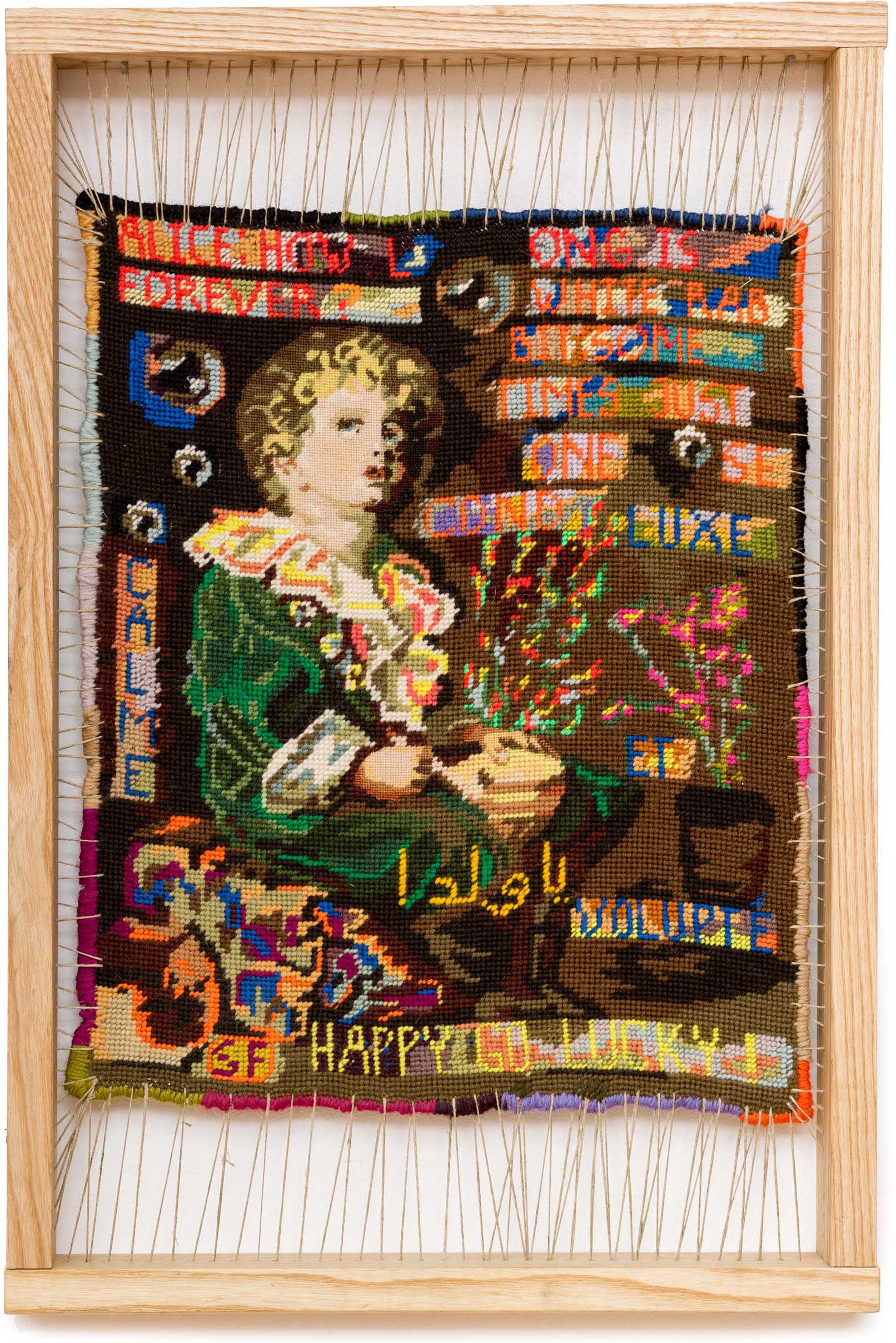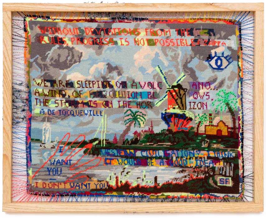 Sylvie Franquet read Arabic and Islamic Studies in Ghent and Cairo, and travelled extensively in the Middle East, Iran and North Africa. The art, history and poetry from those places are major influences in her work. As her core practice Franquet reworks found tapestries, showing a preference for those based on canonical works of art. She overlays these with further images and with found words from poets and thinkers, and text messages from friends. She cites Giacomo Leopardi’s Zibaldone da Pensiere, with its dense collation of thoughts, ephemera and philosophies, as influencing her approach. The laborious process of unpicking, repairing and reworking can take months, resulting in a metamorphosis achieved by the magic power of the needle.