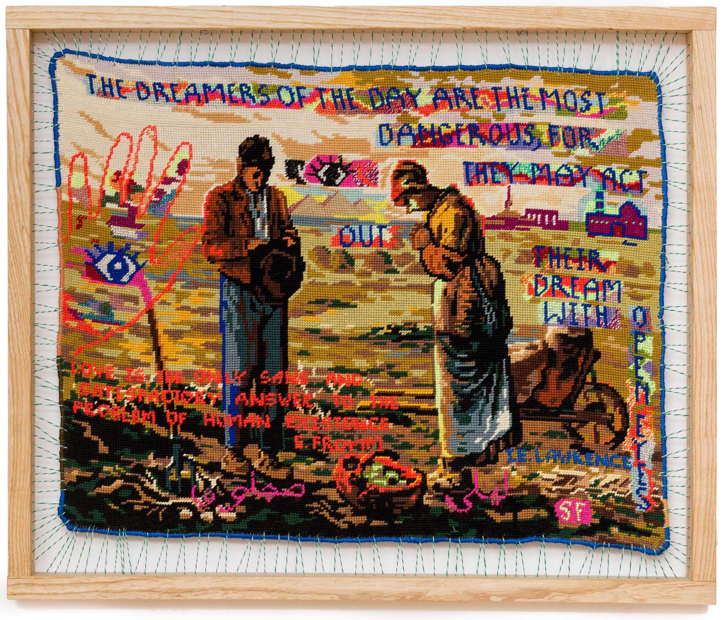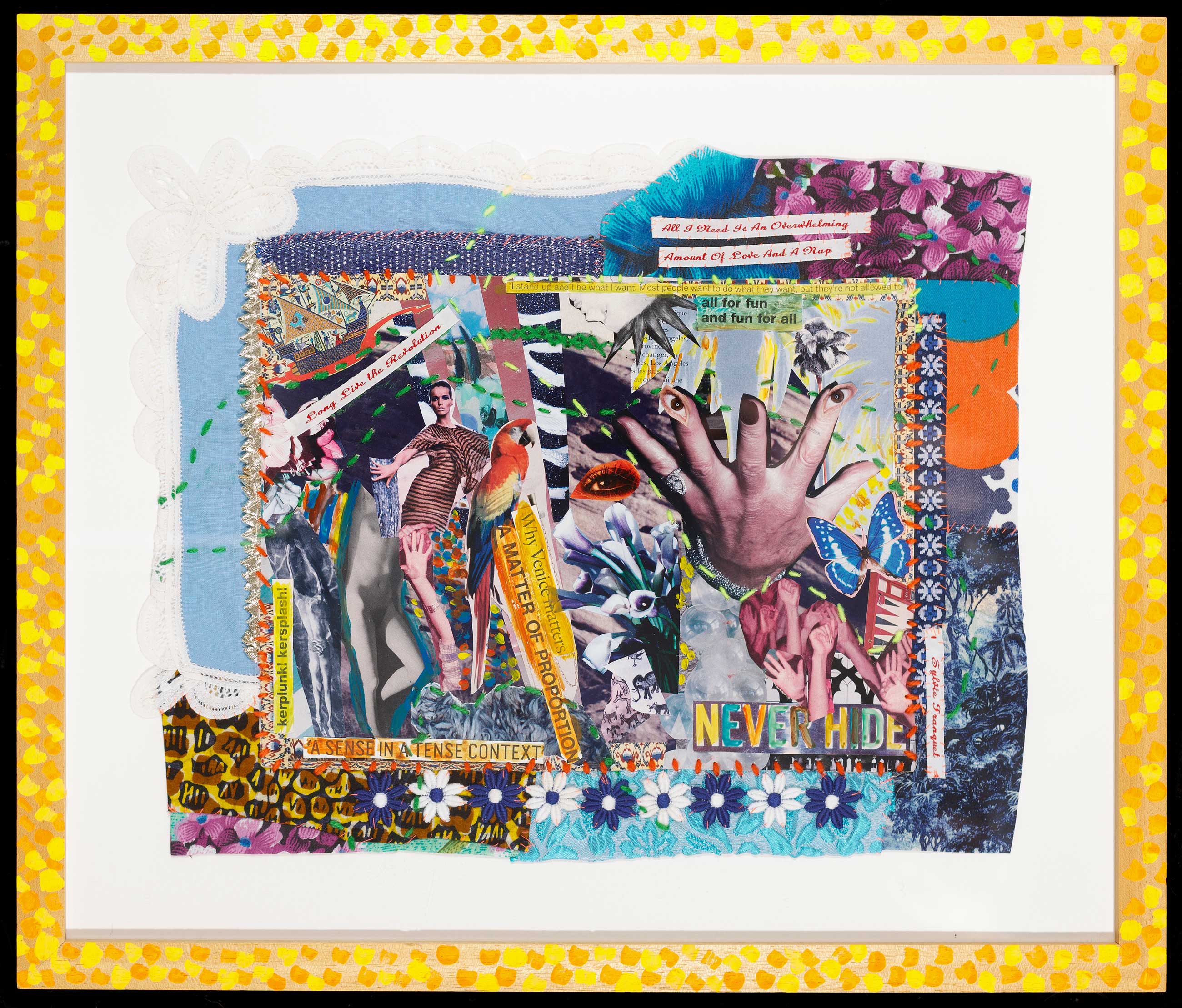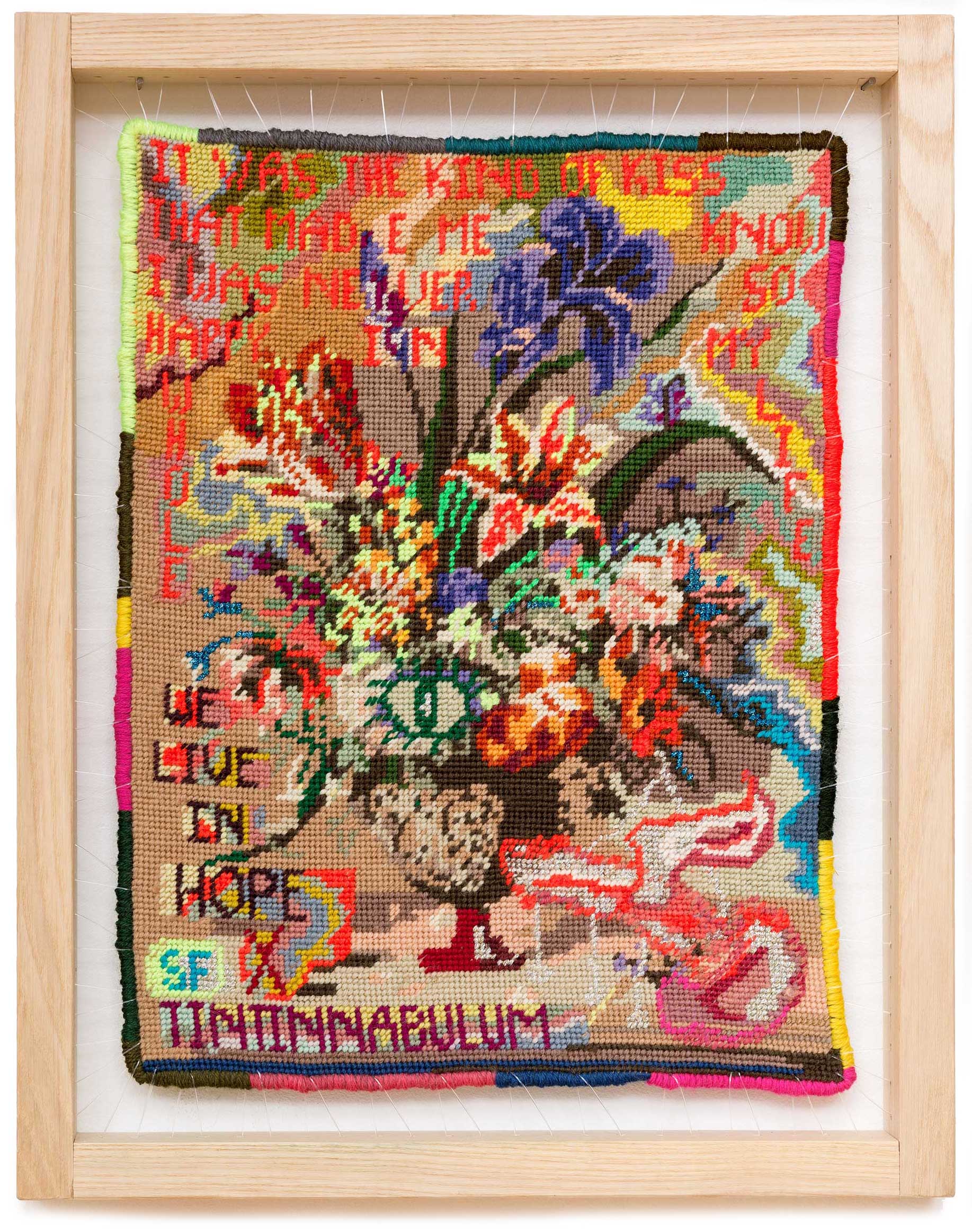 Sylvie Franquet read Arabic and Islamic Studies in Ghent and Cairo, and travelled extensively in the Middle East, Iran and North Africa. The art, history and poetry from those places are major influences in her work. As her core practice Franquet reworks found tapestries, showing a preference for those based on canonical works of art. She overlays these with further images and with found words from poets and thinkers, and text messages from friends. She cites Giacomo Leopardi’s Zibaldone da Pensiere, with its dense collation of thoughts, ephemera and philosophies, as influencing her approach. The laborious process of unpicking, repairing and reworking can take months, resulting in a metamorphosis achieved by the magic power of the needle.