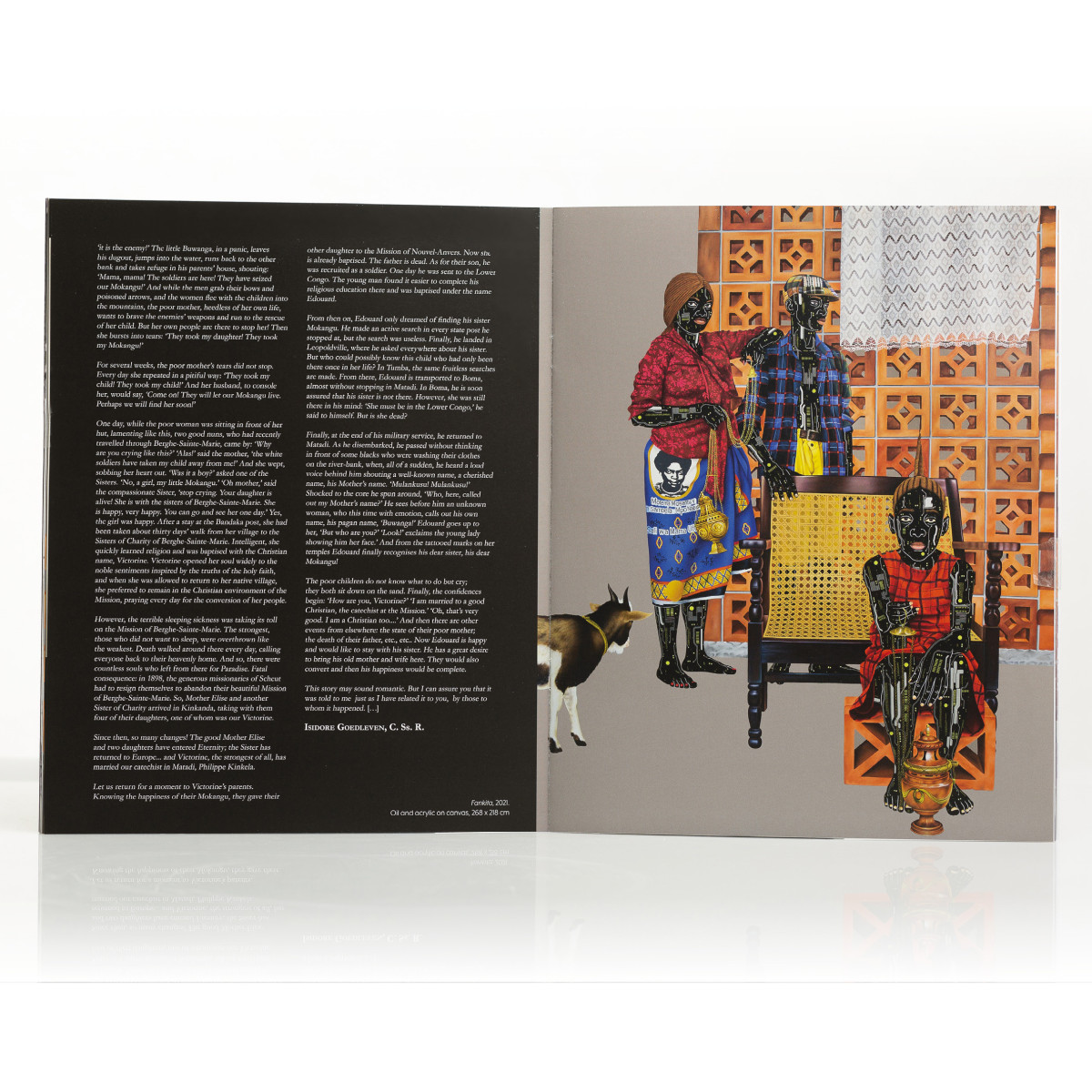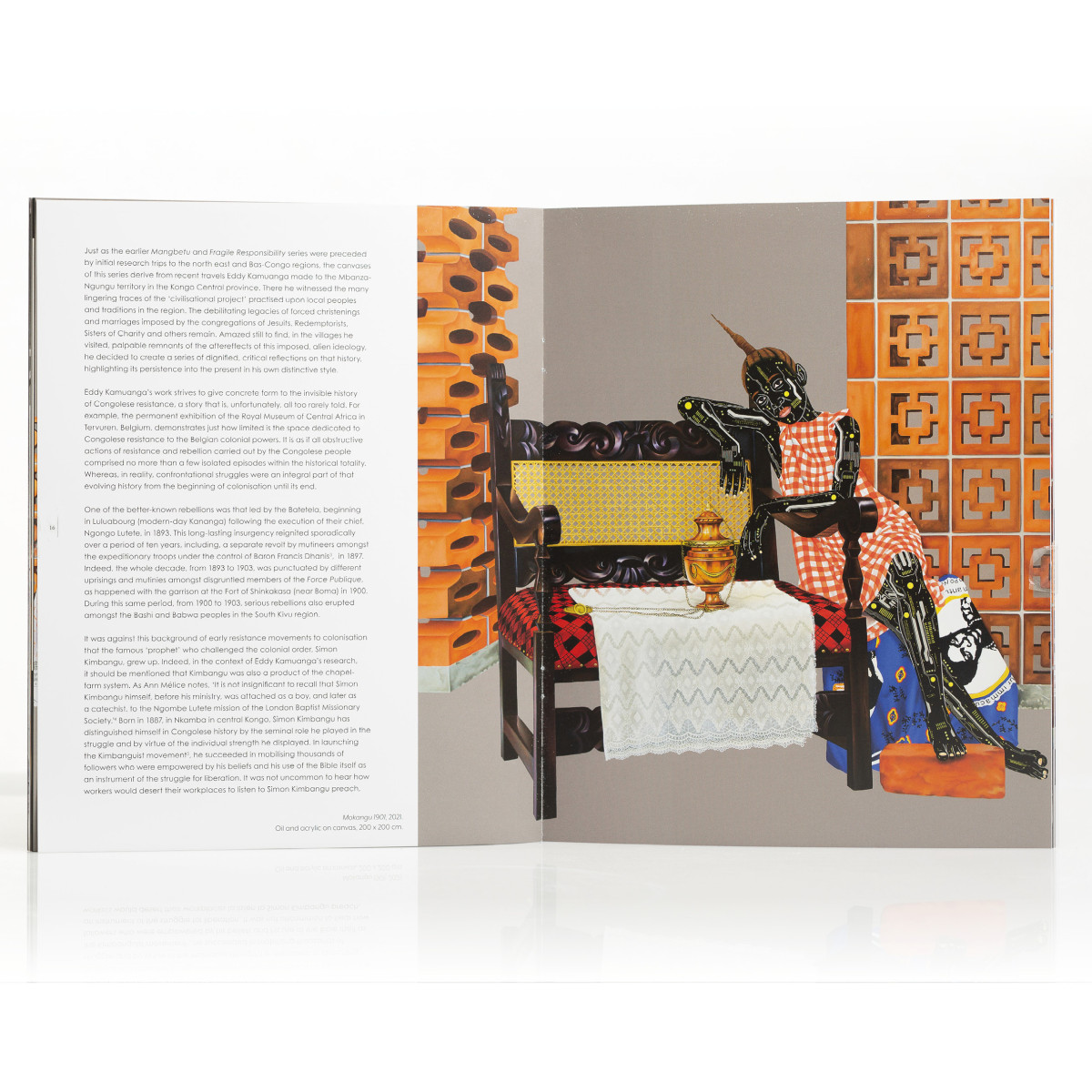 His large-scale figurative compositions possess a depth of historical understanding, with a striking and sophisticated interplay of the intensity of space juxtaposed with emptiness. The listless figures seem to mourn the loss of their traditional cultures, their bright fabrics hanging limply from their bodies, their hands clutching ritual objects whose functions seem less and less apparent. For his latest project, Kamuanga uses the history of the Kongo Kingdom to reveal the legacy of its leaders and examines the impact this has had on contemporary Congolese society. These new works feature objects such as porcelain used by early Portuguese traders as well as pottery, such as Toby jugs, which later entered the trade routes in the Kongo Kingdom for the trade of slaves. In this body of works, Eddy pays tribute to the slaves and ancestors who resisted this human trafficking by presenting a vision of the socio-political landscape of the Democratic Republic of Congo.
