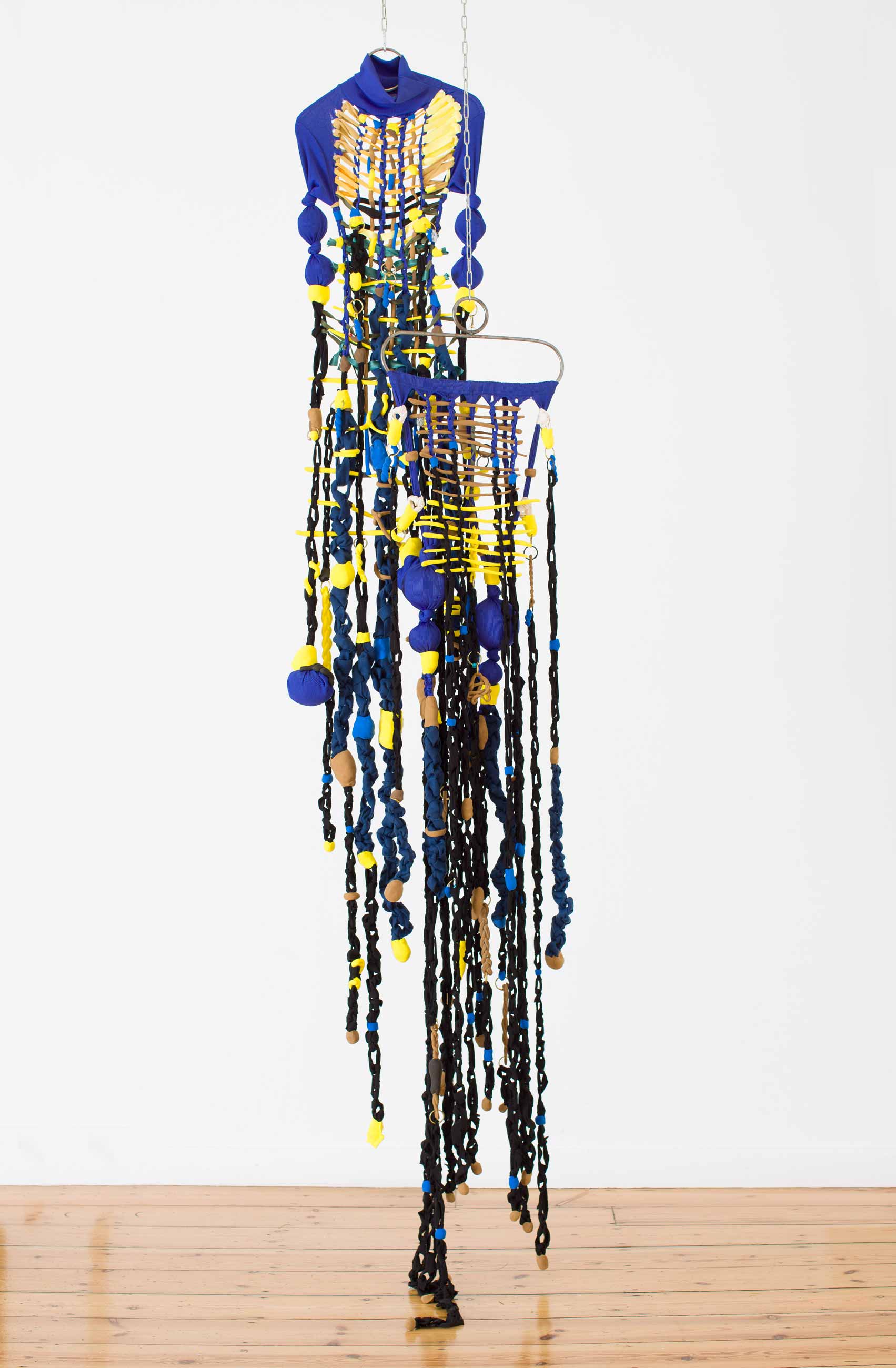 Her practice further blurs the boundaries between sculpture and performance, exemplified by Woven Bodies, a hanging, wearable sculpture composed of knotted and woven nylon cloth adorned with found objects. Moving between opacity and transparency, Weber’s material choices suggest resilience alongside nuanced fragility, weaving layered narratives of intersectional experience.