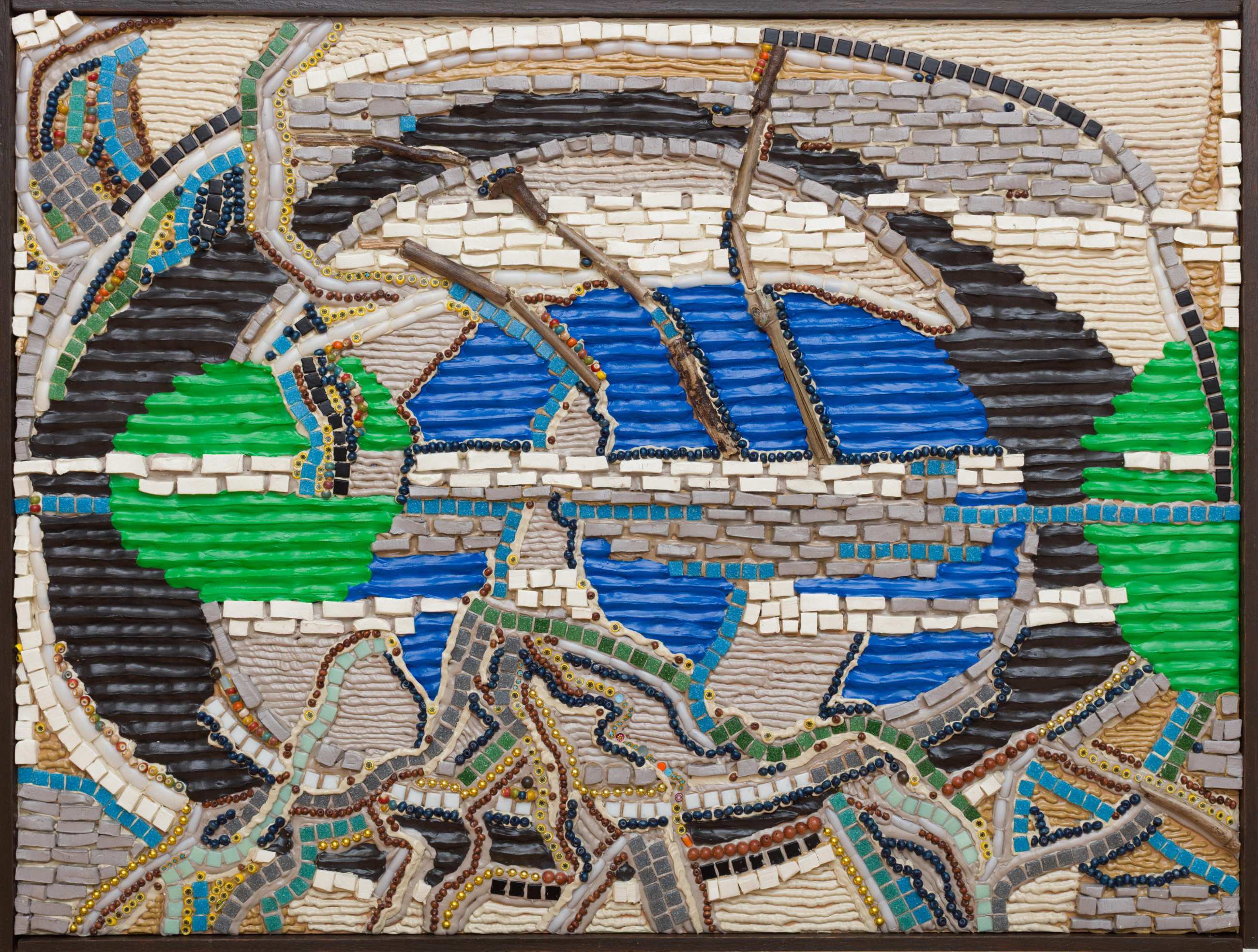 Weber was first exhibited at October Gallery in the group exhibition Emergent Energies (2024), which featured her large-scale relief paintings and hanging sculptures. Her work has since been included in October Gallery exhibitions Material Sensibilities (2025) and Lineages (2026). Her relief paintings, such as Stream of Consciousness from the Cartographies series, are composed of richly textured collage materials including silicone, acrylic paste, modelling compound, resin, print, acrylic nails, beads, corals and shells on wooden board. These works propose an intuitive mapping of the intersectional body that resists Western notions of the grid and linear time, favouring organic forms, energy fields and cyclical temporality as acts of resistance. Weber embeds her fingerprint as an archival trace within the surface, incorporates acrylic nails as symbols of Black female empowerment and scales the wooden supports to her own bodily dimensions. The works invite viewers to encounter the canvas as both an extension of the self and an archive of the intersectional body.