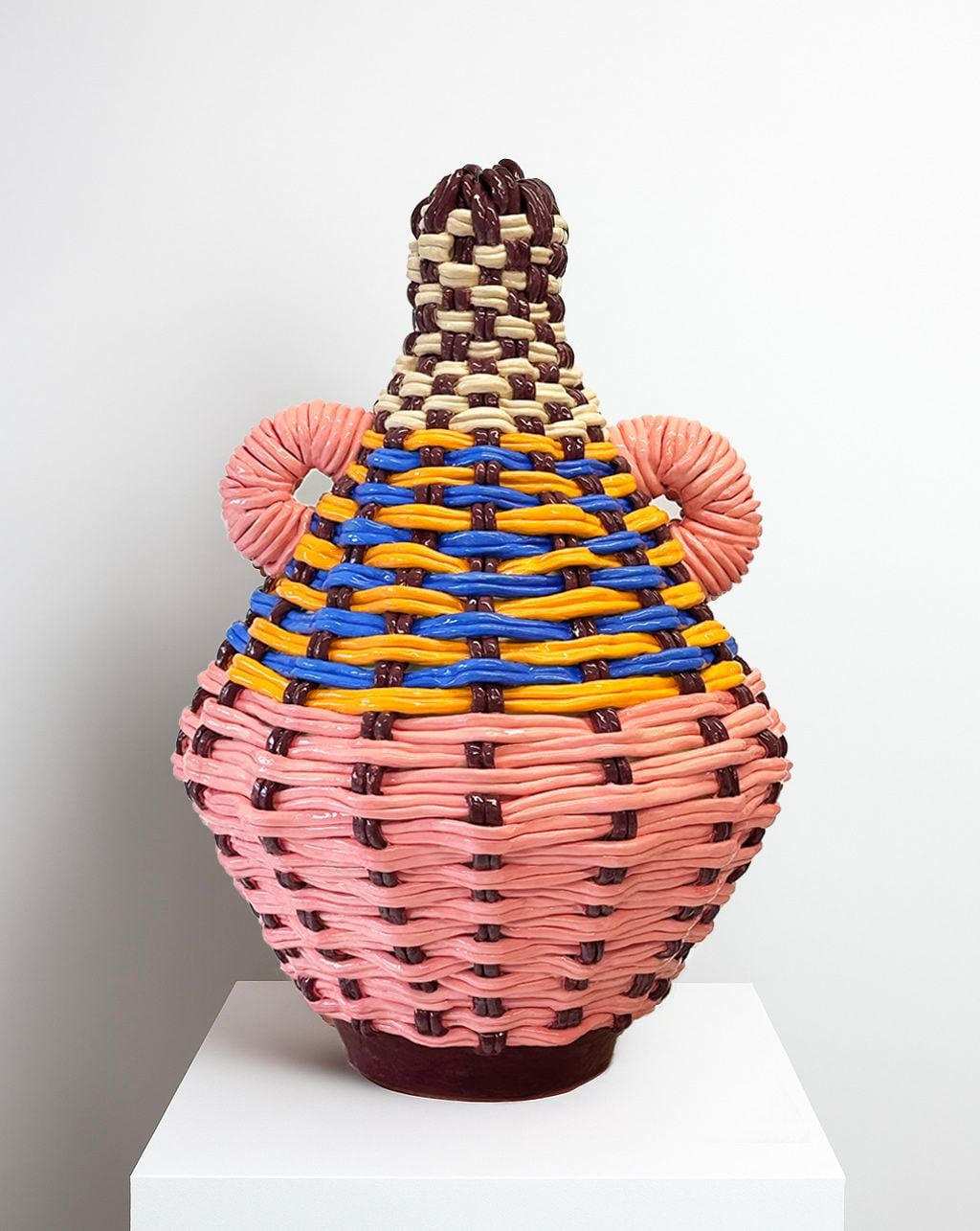Somers graduated from Michaelis School of Fine Art, UCT, Cape Town, South Africa in 2015 and was subsequently awarded a grant to study MA Postcolonial Culture and Global Policy at Goldsmiths, University of London, which she completed in 2020 with distinction. Her large-scale, vibrant works carry barbed social and political critiques. The bodies of her intricate pieces are hand-coiled in the traditional way and then disrupted – their surfaces punctured, woven or adorned with meticulously shaped and painted details. Her ceramics draw on a rich vocabulary of contemporary symbols to examine what she refers to as the “subtle treason of objects”. Their hand-coiled forms bristle, morph and move, fusing political commentary with a strong sense of domestic intimacy. These idiosyncratic creations evoke a sense of play, by deliberately combining excessive ornamentation with veiled political commentary that draws attention to women’s work, cheap labour, overconsumption and the impact of eco-racist practices throughout the Global South. Additionally, the weighted shape of her ceramics – favouring curvature and vessel form – pose as a feminist engagement of sculpture. Somers asks us to question the ways in which the post-colony co-opts us into its campaigns of violence against marginalised peoples, she impels us to consider how ordinary cruelty can become.