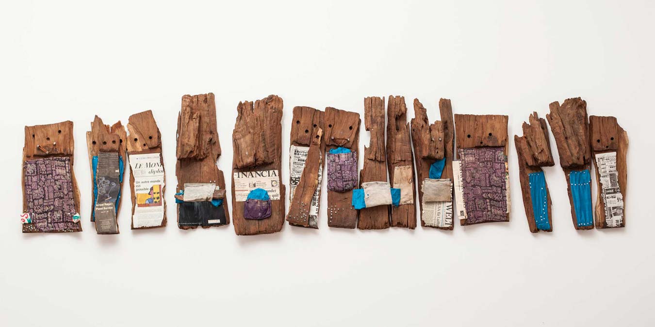 Tropical hardwoods and mixed media, 58 x 225 x 13 cm.