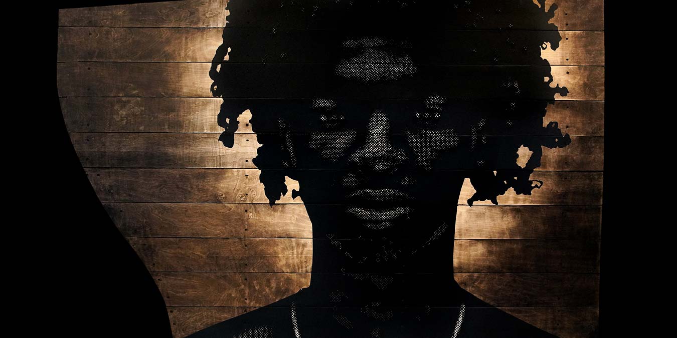Alexis Peskine’s (b.1979, France of Afro-Brazilian/Russian descent) signature works are large-scale mixed media ‘portraits’ of the African diaspora, which are rendered by hammering gold leafed nails of different gauge, with pin-point accuracy, into stained wood. Peskine depicts figures that portray strength and perseverance, with energy startlingly reminiscent of the Minkisi “power figures” of the Congo Basin.