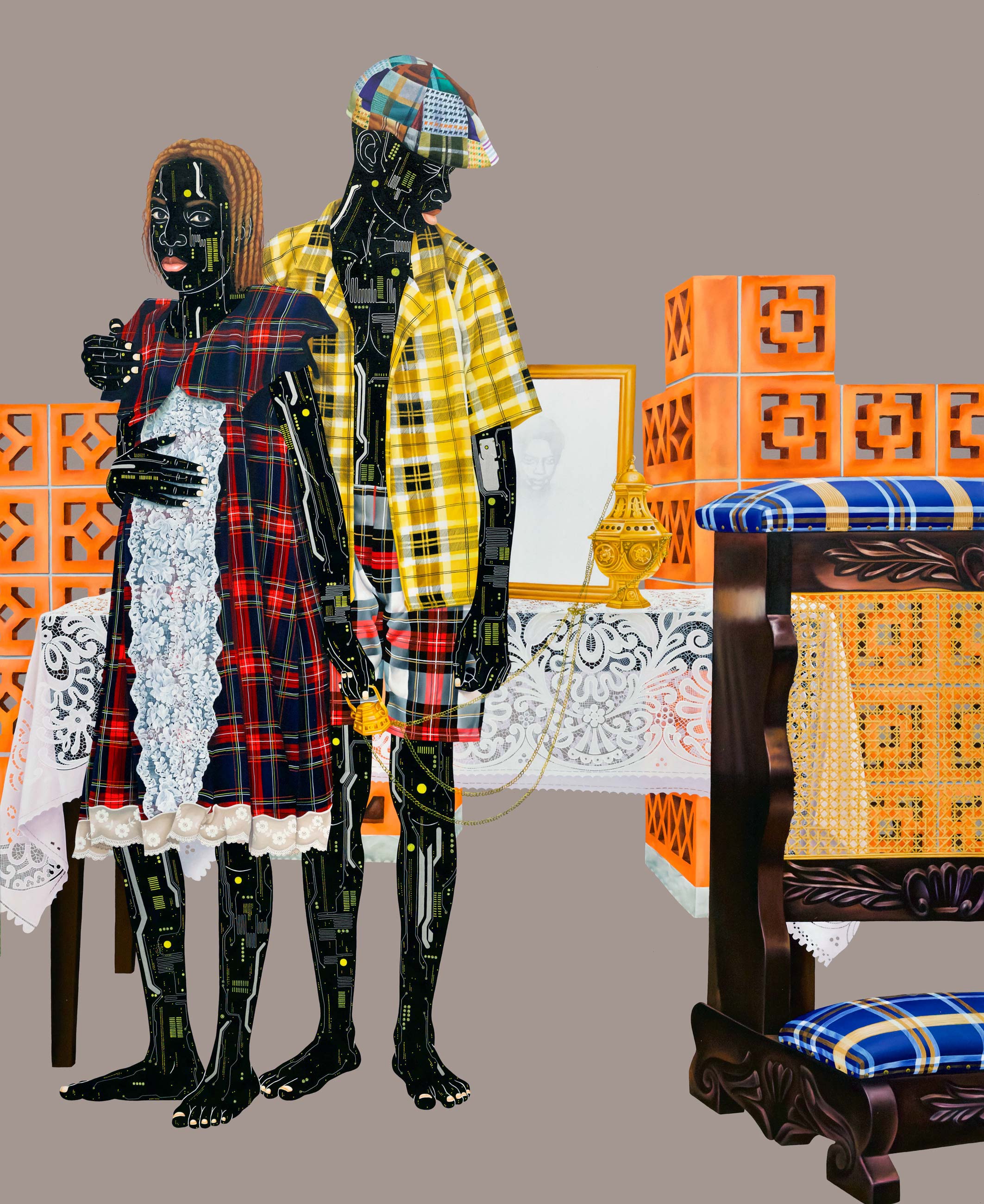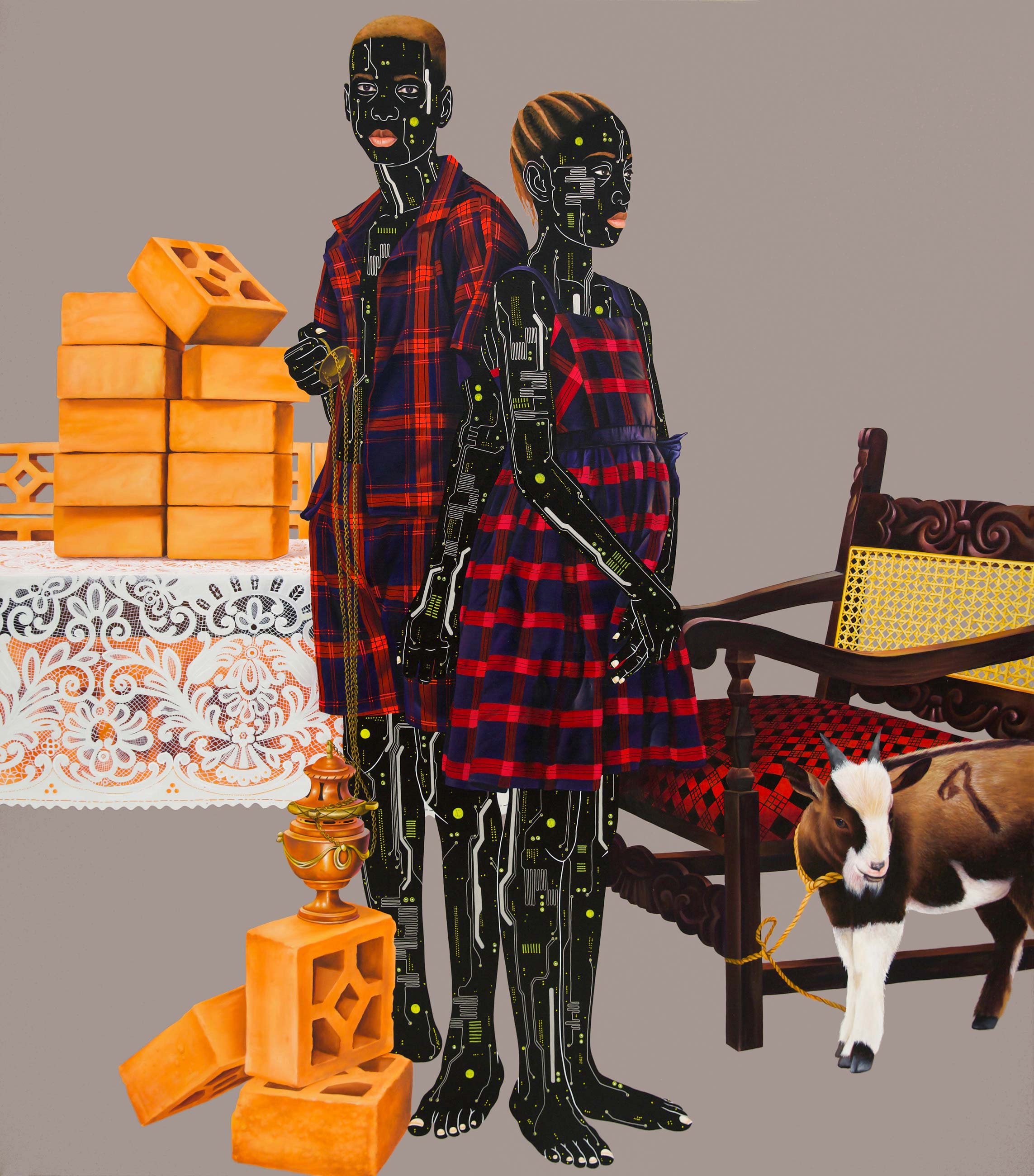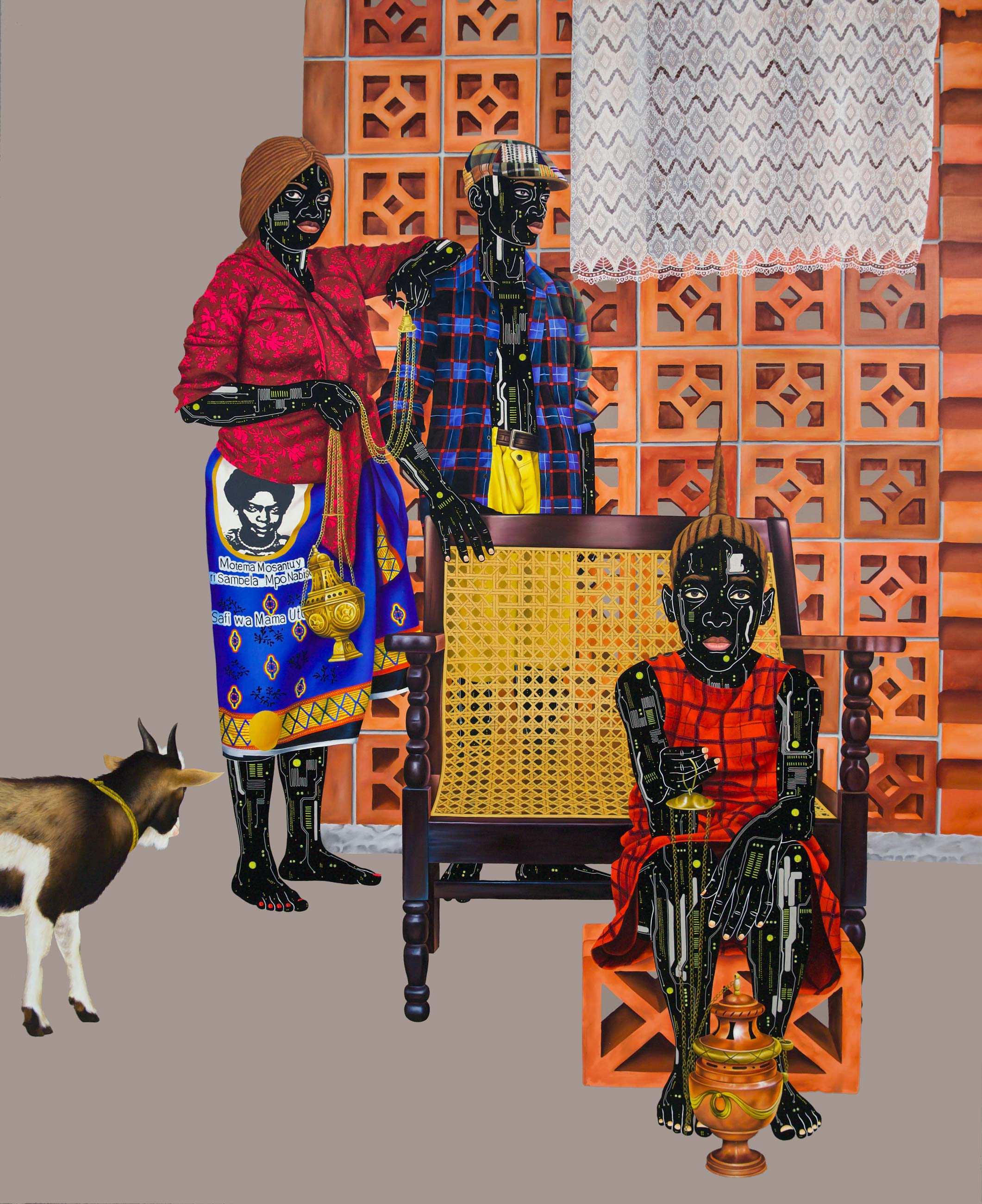 Kamuanga continues to portray his subjects with bare skin replaced by intricate electronic circuitry. This references the components of our everyday modern devices, technology that could not exist without coltan, a substance mined at volume in the DRC, with great human and environmental cost.