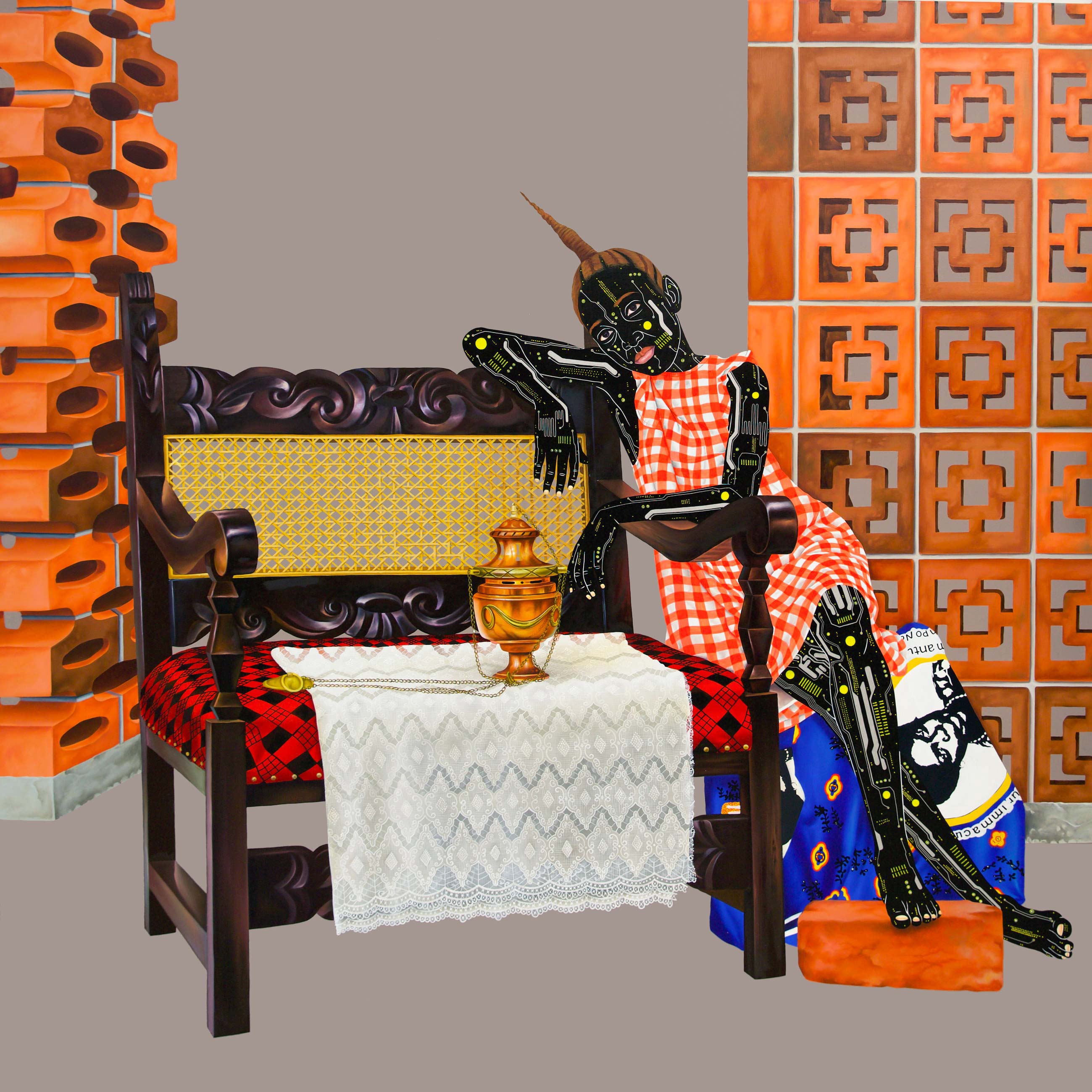 In 1893, the religious order of the Jesuits established the governing system of chapel-farms in the former colony, which were intended to offer shelter to Congolese children or orphans, but in fact trained them in military discipline as well as in handicrafts and agriculture. In Kamuanga’s new paintings, his figures are flanked by these red brick ‘sanctuaries’ and shadowed by religious objects. These children served as free labour, fuelling the colonial mission for decades, resulting in a generation of Congolese people cut off from their families and communities. Through these works, Kamuanga reminds us that the Catholic Mission was instrumental in fostering the exploitation of people and lands. Distinctive vivid colours and careful textures, remnants of that exploiting system, run as a thread through this new body of work.